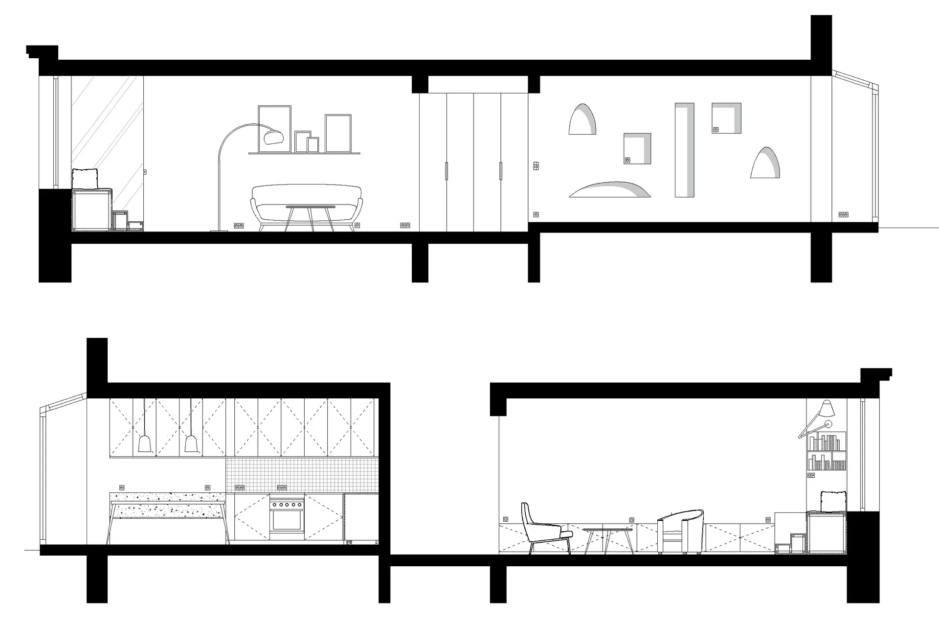La pièce étant étroite, il est capital de choisir un mobilier aux dimensions adaptées pour respecter ses proportions. En complément, les rangements sur mesure permettent d'optimiser le rangement en empiétant un minimum sur la surface habitable. Nous avons donc dessiné un grand meuble bas peu profond dans le prolongement du coin lecture qui fait office de meuble TV et offre de nombreux rangements.