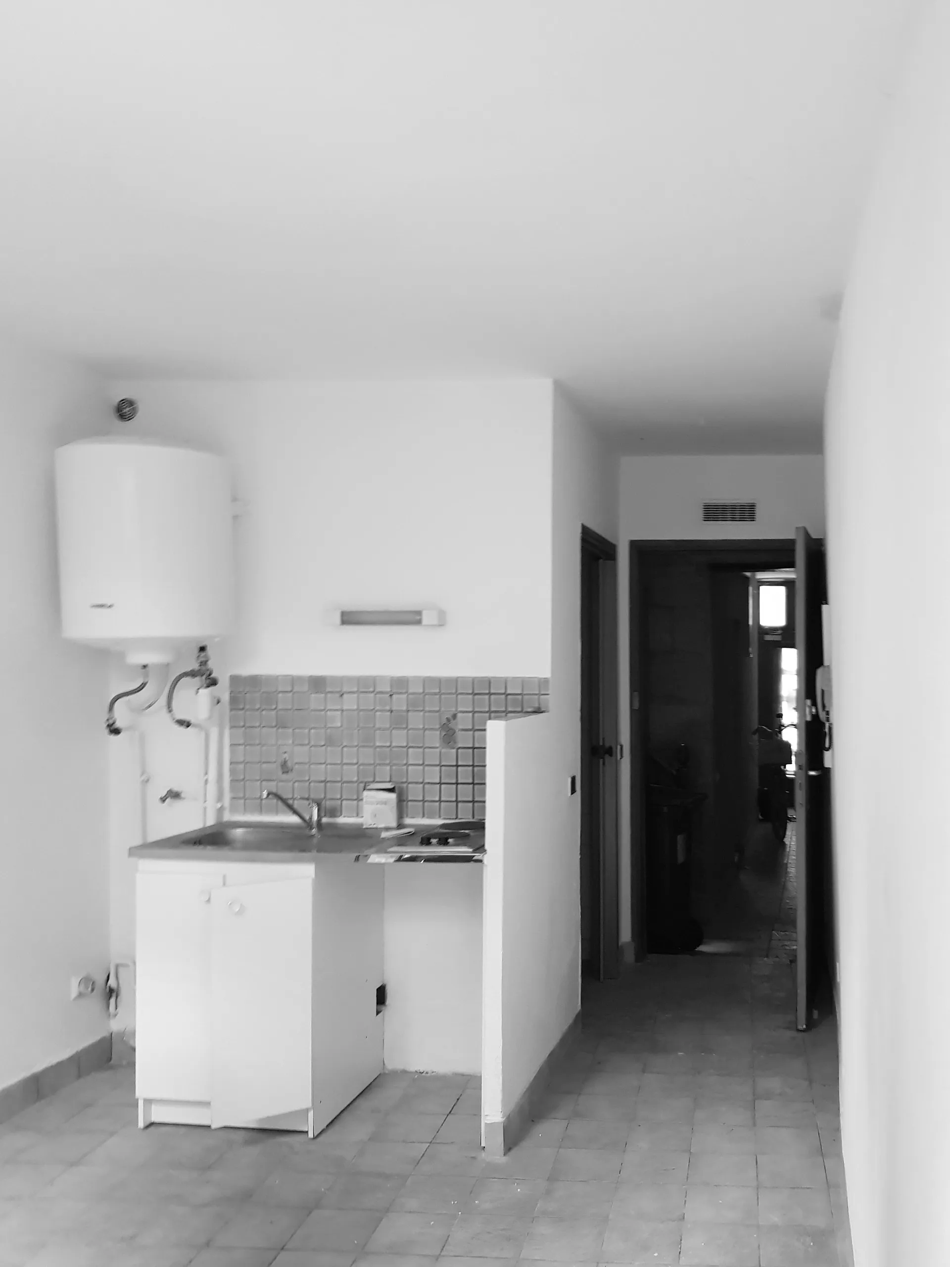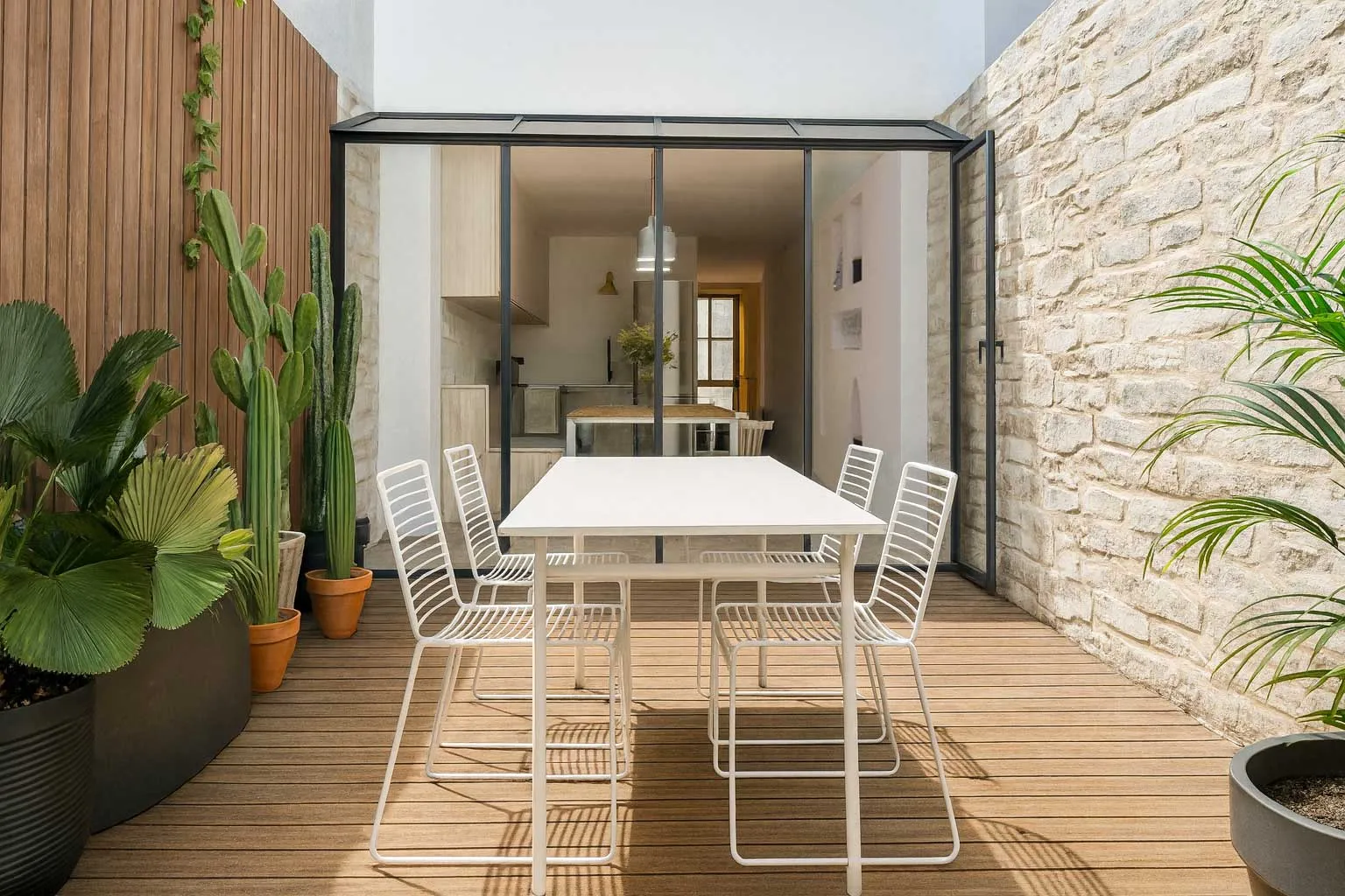 Grâce à la démolition de la pièce du fond et du couloir qui y mène, la courette existante est transformée en grande terrasse ou arrière-jardin. La nouvelle verrière permet quant à elle de faire entrer un maximum de lumière naturelle dans la cuisine dinatoire, et est visible depuis l'entrée de la maison. Cette ouverture transforme radicalement l'atmosphère de la maison, créant une connexion précieuse avec l'extérieur.