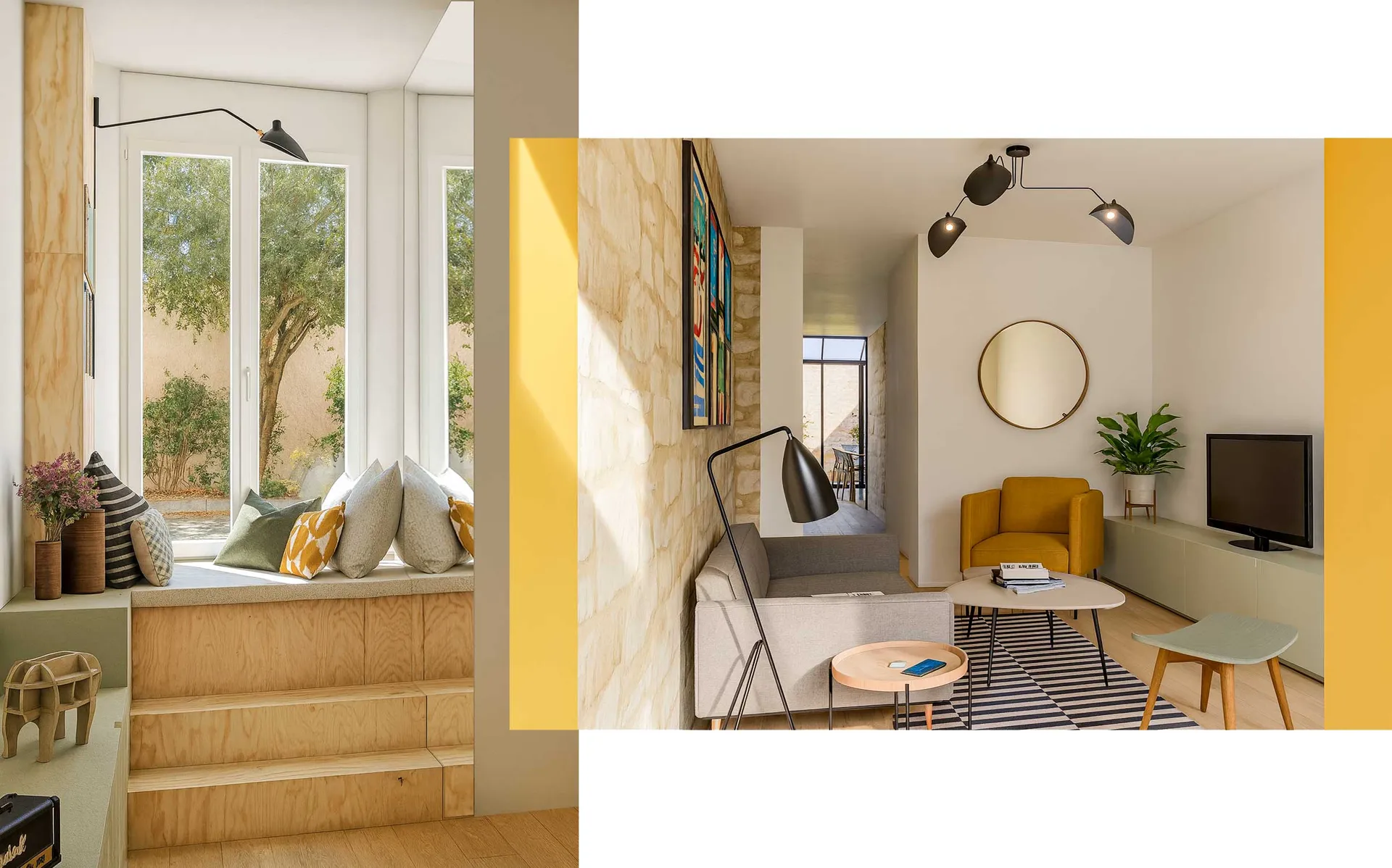 Le coin lecture est surélevé de quelques marches pour venir s'installer sous la fenêtre et le rendre plus intime, aux allures de petite cabane. Un miroir plaqué sur le dos du dressing permet de réfléchir la lumière de la fenêtre et d'en apporter ainsi un maximum dans le reste de la pièce. La peinture jaune moutarde sur les murs et le plafond permet d'accentuer la délimitation de l'entrée tout en apportant du caractère à la pièce.