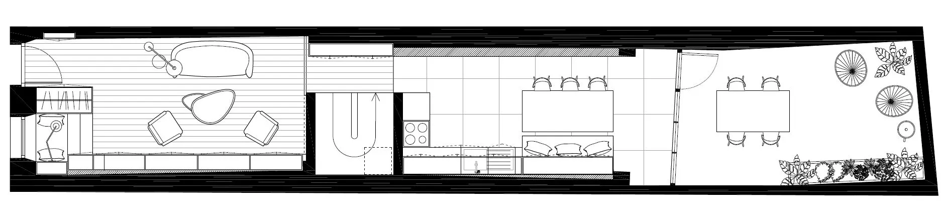 Décomposée en plusieurs studios avec le temps, le point de départ a été de reformer une seule et même maison en abattant la cloison de l'entrée qui formait un couloir long et étroit. Une pièce de vie aux proportions agréables a ainsi été reconstituée. Cependant, toute la longueur n'est pas exploitable pour installer le salon – elle est trop importante par rapport à la largeur pour que cela soit équilibré.