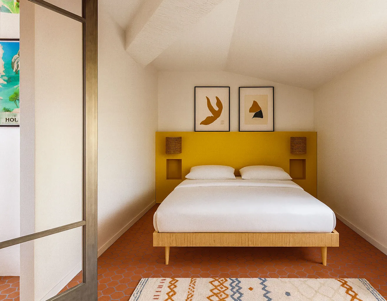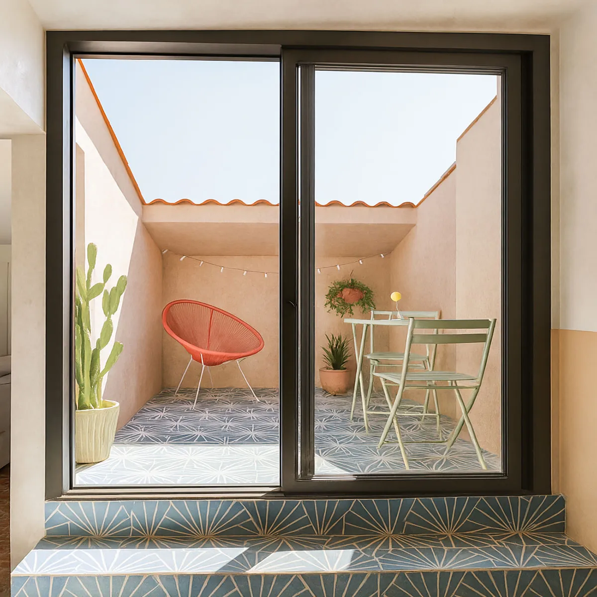 Pour compenser la surface prise par la tropézienne et maintenir une bonne distribution de la lumière, j'ai créé une petite baie triangulaire côté salon. Cette ouverture permet à la lumière naturelle de se diffuser depuis la terrasse vers les espaces intérieurs. Du côté de la chambre, j'ai installé une porte vitrée positionnée face à la fenêtre existante. Ce choix crée une traversée lumineuse qui change complètement l'atmosphère de cette partie de l'appartement, autrefois la plus sombre.