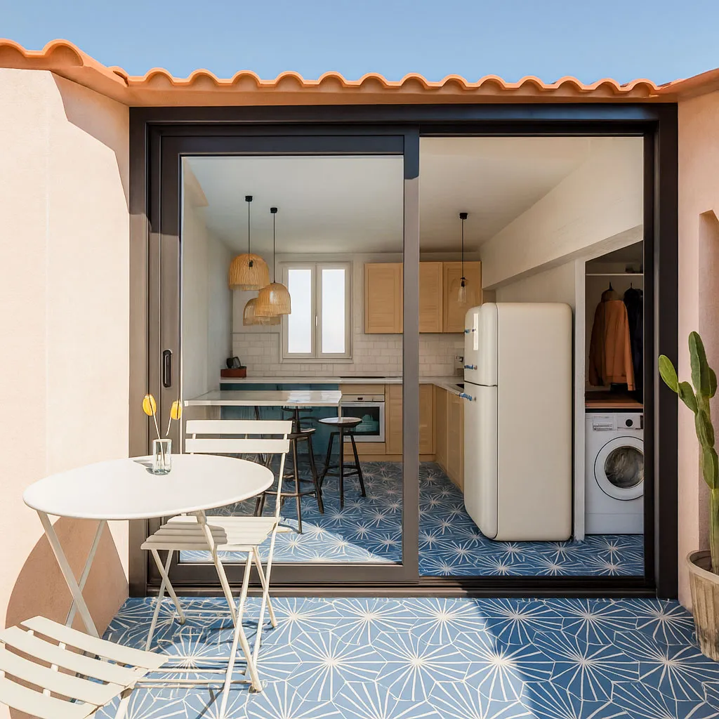 La nouvelle terrasse a naturellement orienté l'organisation spatiale de l'appartement. En tenant compte de l'emplacement de la tropézienne et des arrivées d'eau existantes, j'ai implanté la cuisine dinatoire dans le prolongement direct de la terrasse. Cette disposition facilite les repas en extérieur et crée une vraie continuité entre intérieur et extérieur.