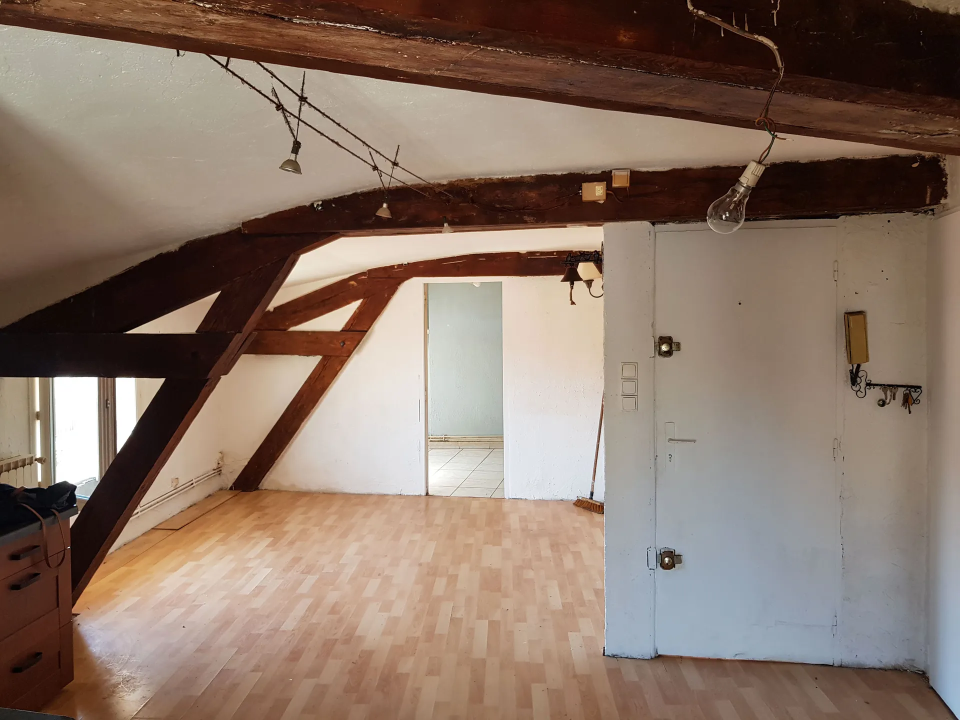 Lorsque mon client m'a contacté pour ce projet de rénovation, l'appartement qu'il venait d'acquérir au dernier étage présentait tous les défis typiques d'un logement sous combles mal entretenu. L'espace était sombre, dans un état insalubre, avec une douche improvisée dans un angle. La configuration initiale se limitait à deux volumes : une pièce à vivre à l'entrée, puis une chambre avec un coin salle d'eau sommaire.