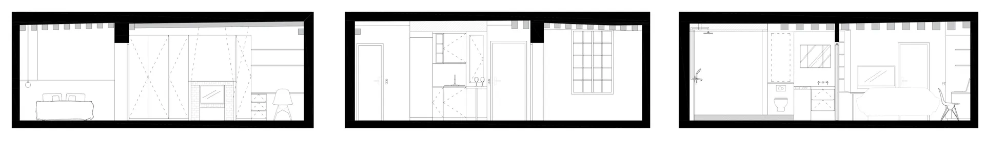 La première intervention a consisté à repenser entièrement la distribution des pièces. Les toilettes, bien trop grandes, deviennent une douche spacieuse, tandis que l'ouverture de la salle de bain est intervertie afin d'apposer, de l'autre côté de la cloison, une cuisine petite mais extrêmement optimisée.