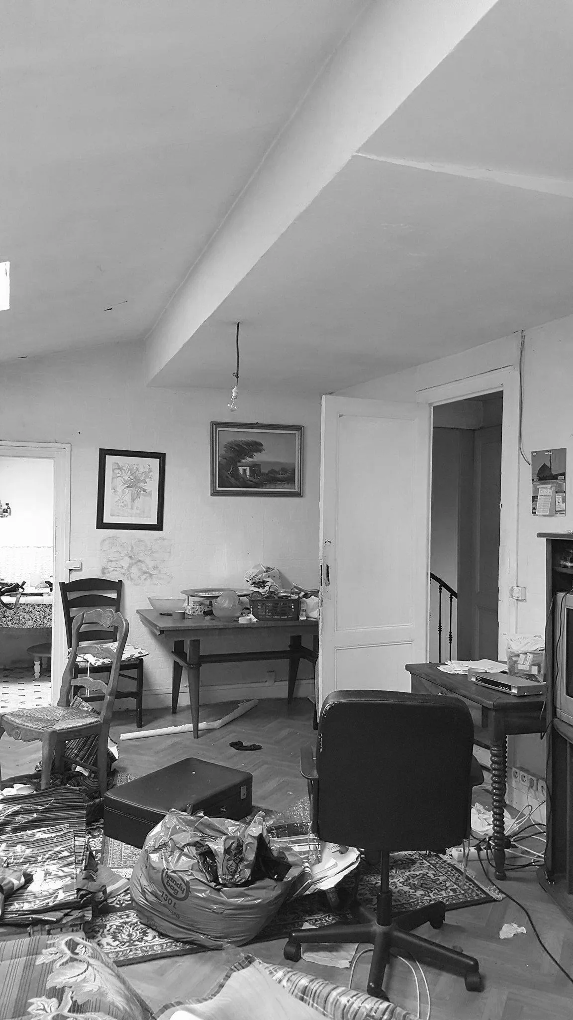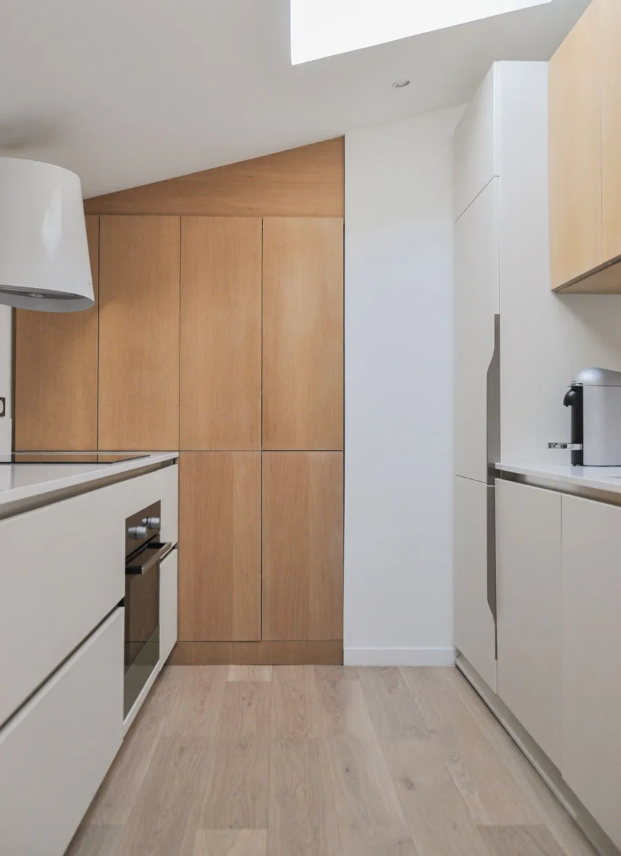 Partant de là, tout le volume est désossé pour retrouver les plafonds rampants et le plateau vide. Cette opération de déconstruction permet de redécouvrir l'architecture d'origine de ces combles, avec leurs pentes caractéristiques qui donnent tant de personnalité aux appartements sous les toits.