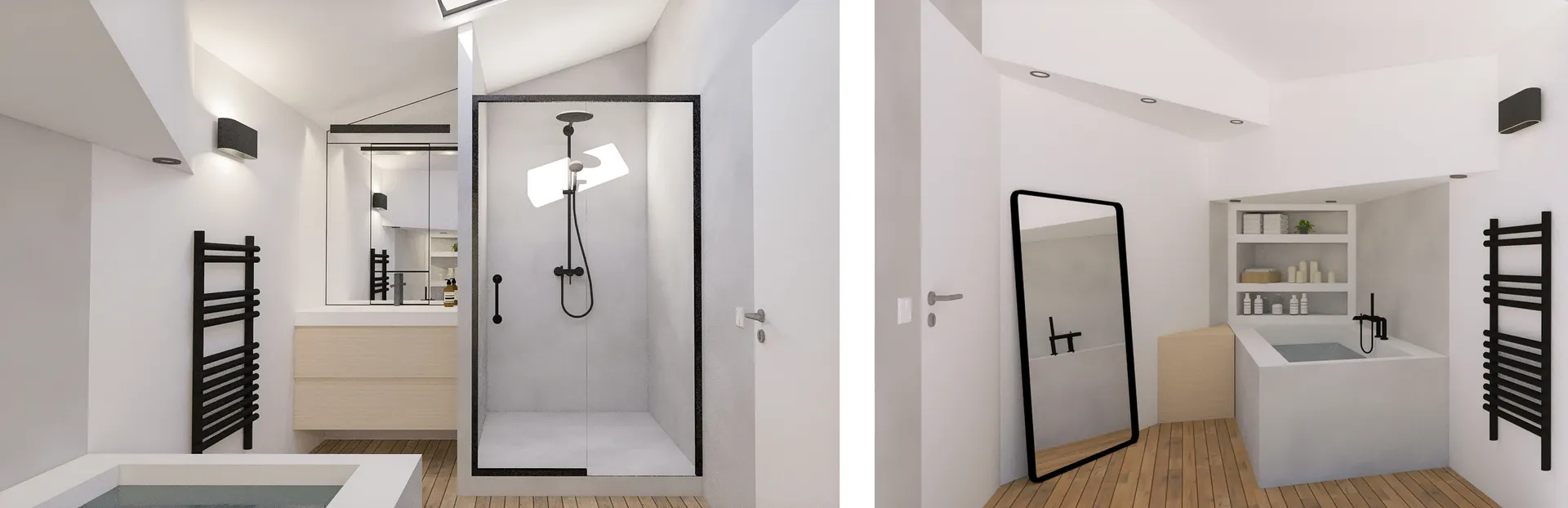 Afin d'optimiser l'espace sous la retombée existante – ces contraintes typiques des combles –, une baignoire encastrée et des niches en plâtre sur mesure sont placées dessous. Cette solution intelligente transforme une contrainte architecturale en opportunité fonctionnelle, en exploitant chaque centimètre disponible.