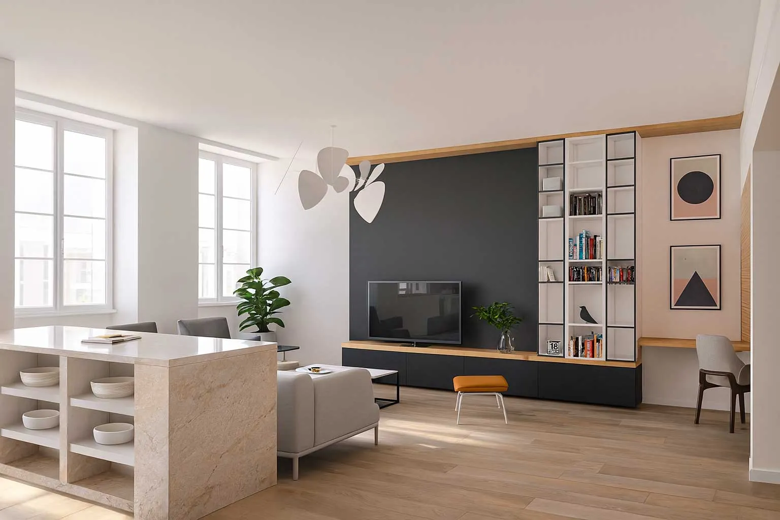 Cette rénovation partielle d'appartement ancien à Bordeaux illustre comment il est possible de moderniser un bien tout en respectant son caractère patrimonial. Les rangements invisibles, la porte coulissante à rideau pour le bureau, et l'îlot en pierre de Frontenac créent un équilibre subtil entre fonctionnalité contemporaine et respect de l'existant.