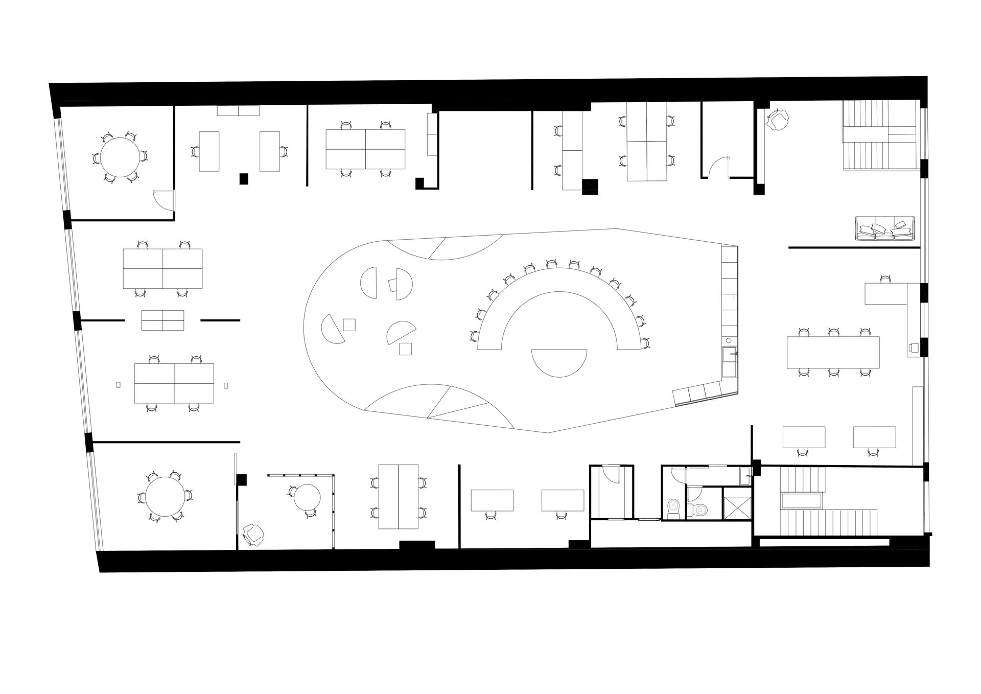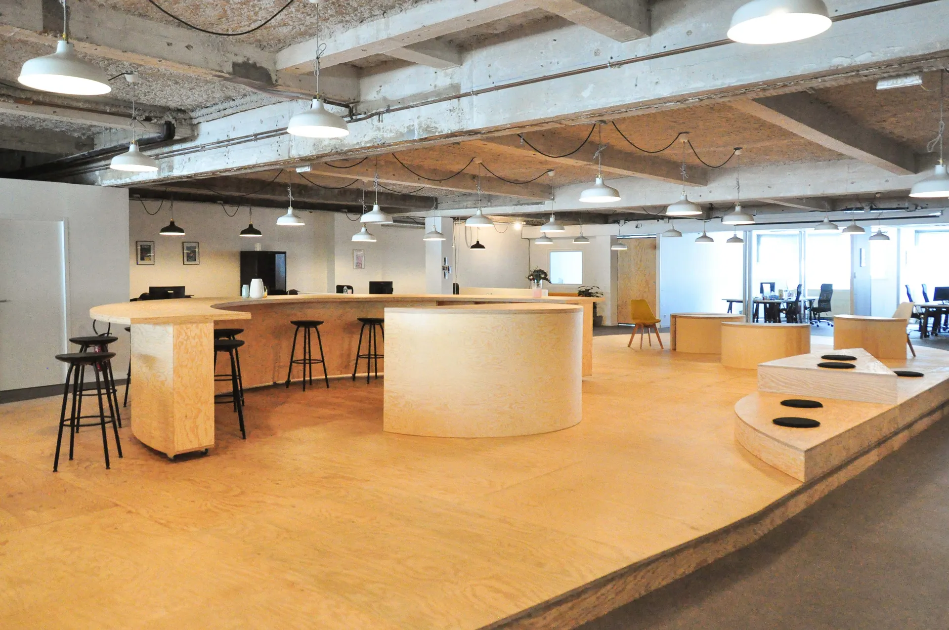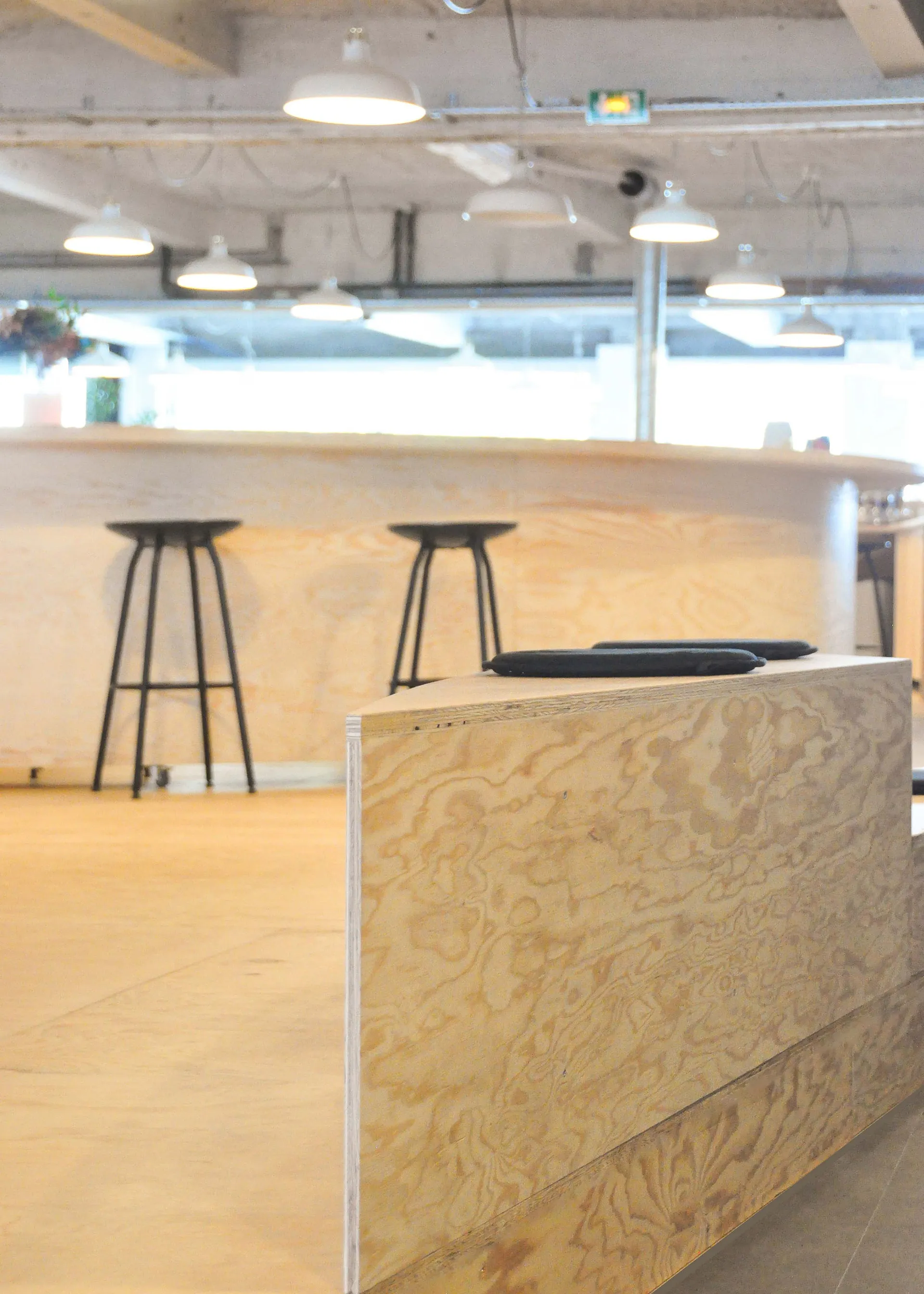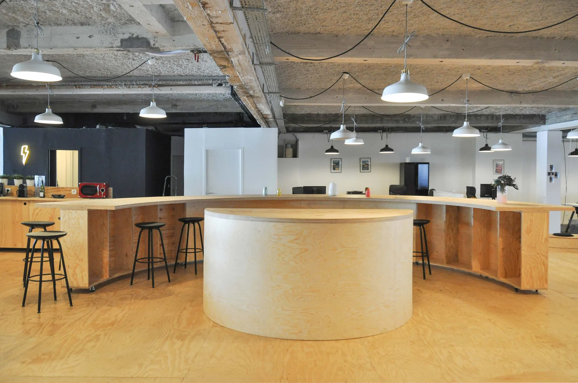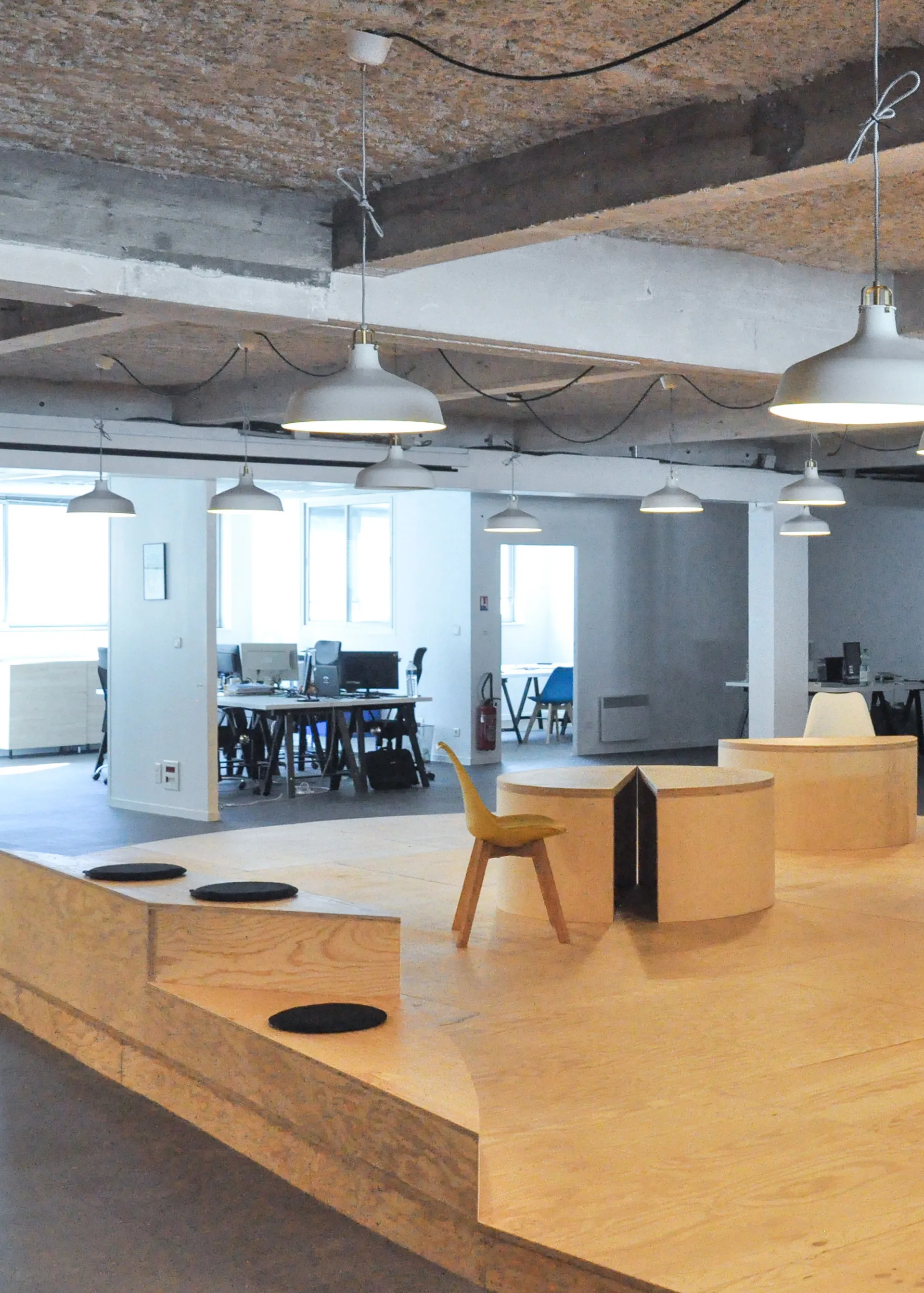 L'utilisation du contreplaqué de pin pour créer une plateforme centrale avec mobilier intégré apporte chaleur et caractère à cet espace de coworking. L'esthétique industrielle assumée – poutres apparentes, matériaux bruts – crée une ambiance propice à la créativité et à l'innovation, en phase avec l'esprit startup.