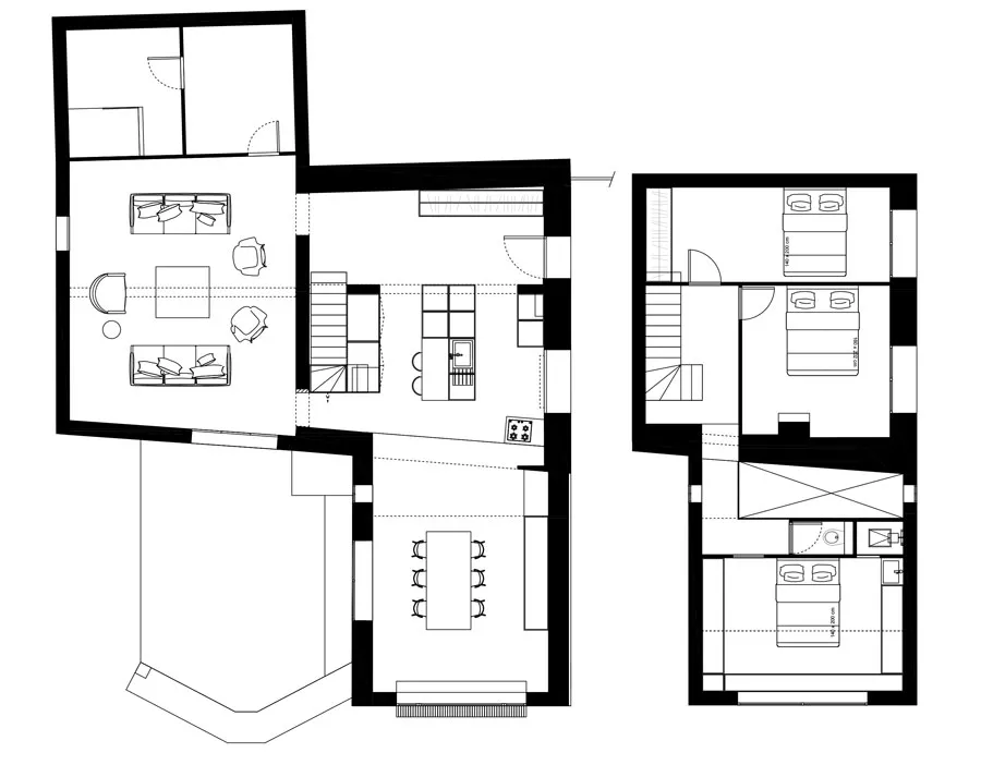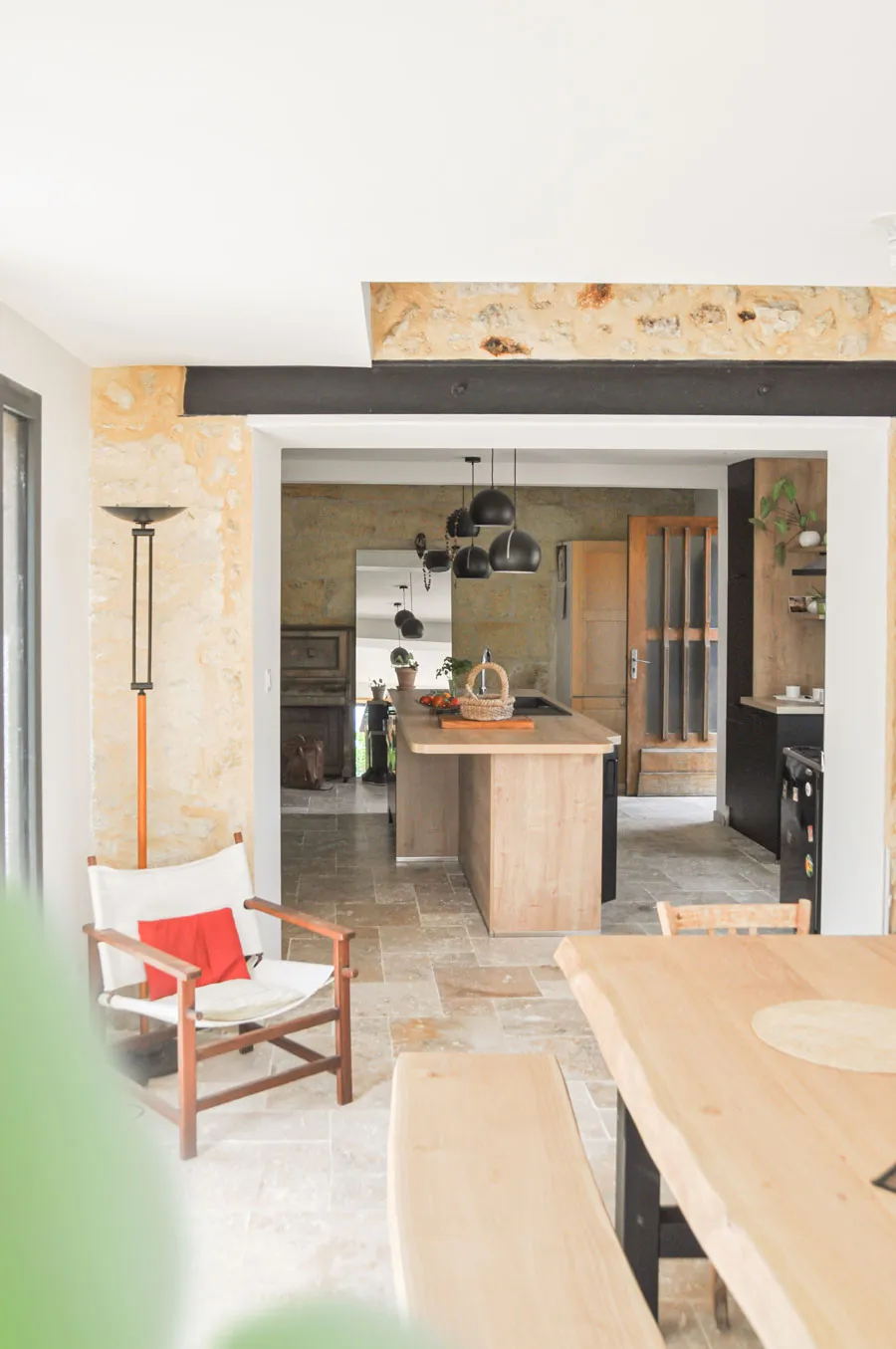 Le vide sur séjour se devine dans ces volumes, et l'ouverture de l'ancien mur de façade en pierre est bien visible. Le nouvel intérieur fait la part belle aux matériaux naturels : bois, métal et travertin s'associent pour une ambiance simple et authentique, en harmonie avec le caractère de la bâtisse.