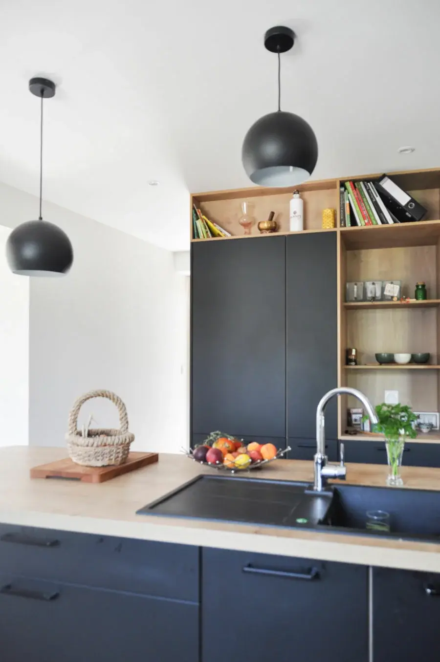 Viennent ainsi se placer le frigo, le congélateur et une grande quantité de rangements complémentaires, le bloc étant ouvert de niches par endroit pour le rendre plus décoratif et fonctionnel. Cette solution ingénieuse résout simultanément plusieurs problématiques : l'escalier devient plus confortable, la cuisine gagne en rangements, et l'ensemble s'intègre harmonieusement dans le nouvel espace.
