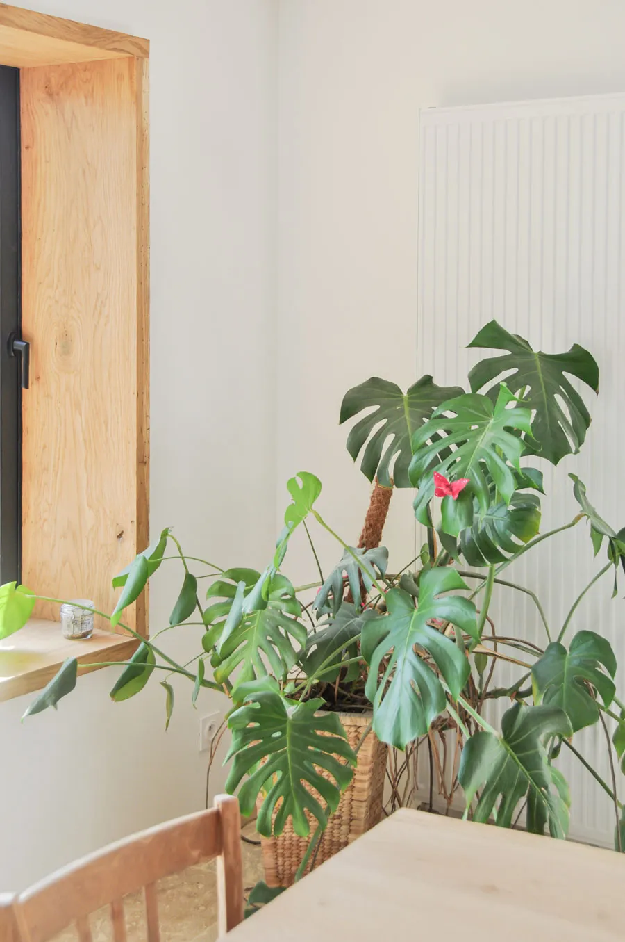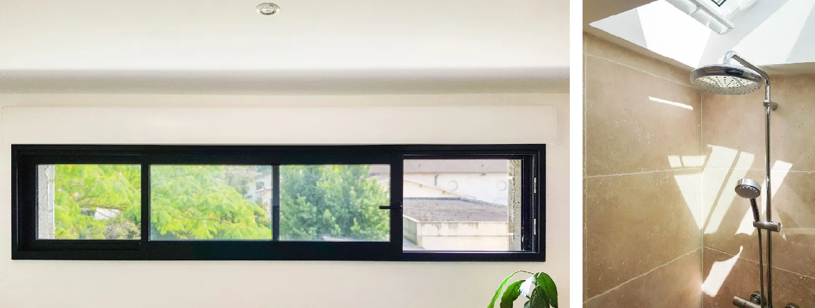 L'imposte fixe placé en hauteur, sur la façade Est, permet de faire rentrer la lumière du matin au centre de la pièce sans créer de vue peu esthétique. Sur la façade Ouest, en face, le même lui répond et un deuxième est placé juste en dessous pour offrir toujours plus de lumière et d'ouverture vers le jardin.