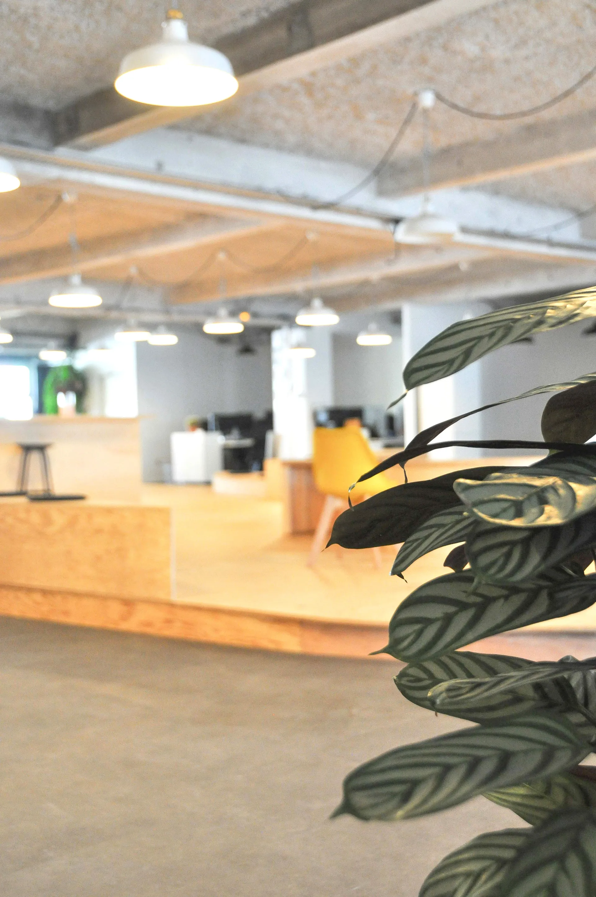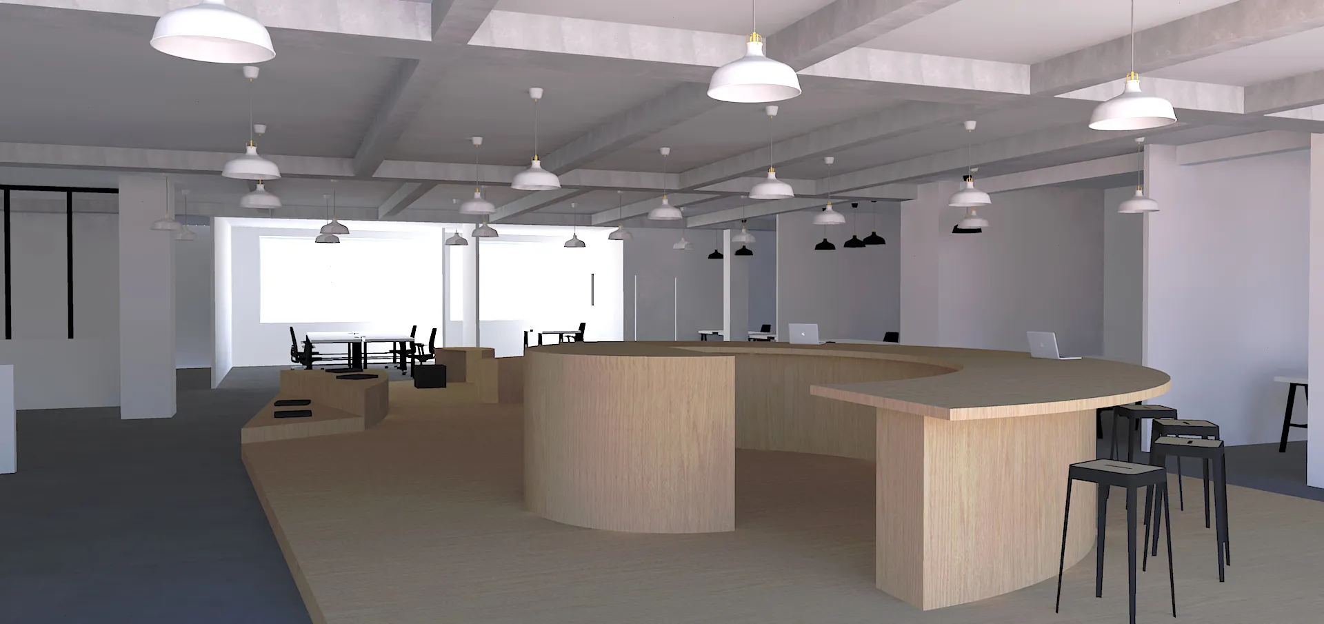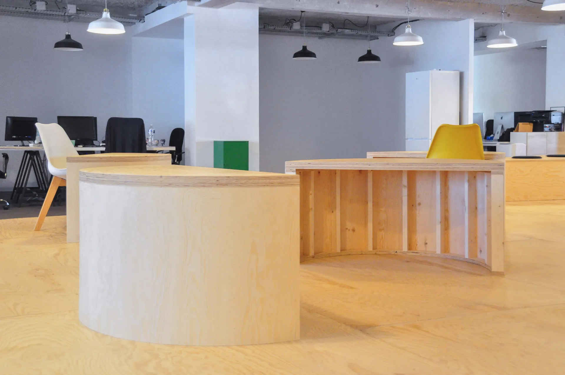 L'utilisation du contreplaqué de pin pour créer une plateforme centrale avec mobilier intégré apporte chaleur et caractère à cet espace de coworking. L'esthétique industrielle assumée – poutres apparentes, matériaux bruts – crée une ambiance propice à la créativité et à l'innovation, en phase avec l'esprit startup.