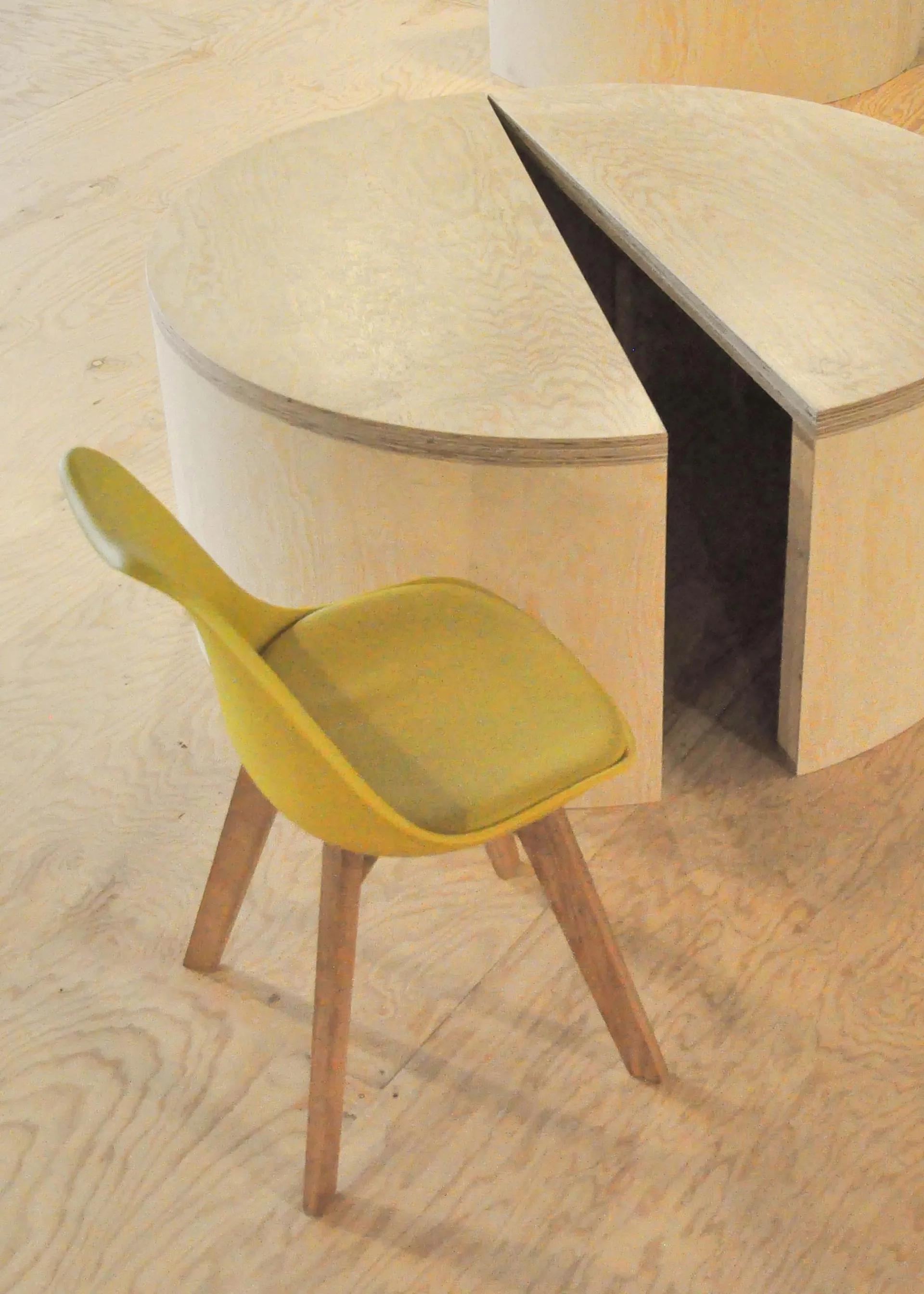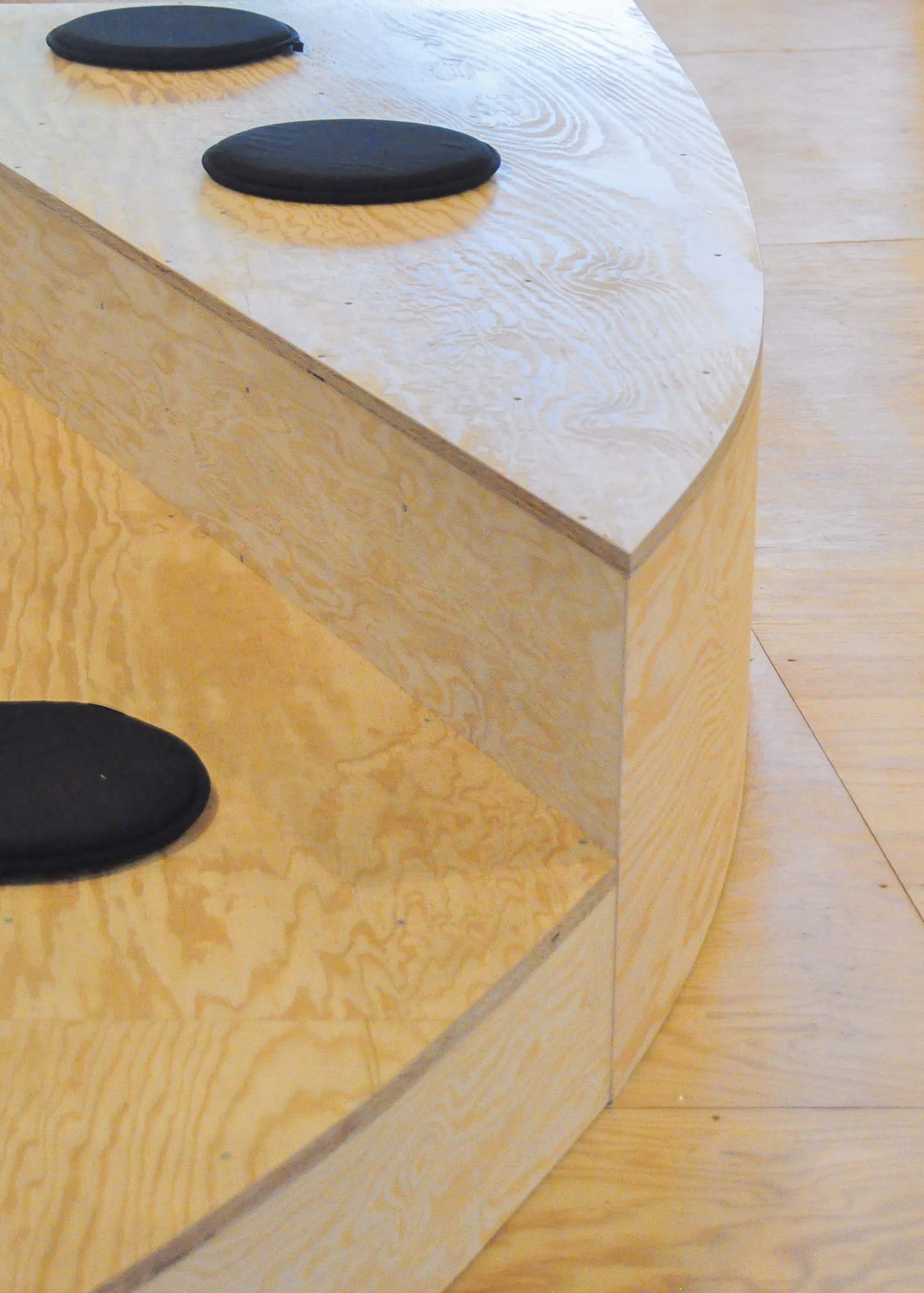 C'est le contreplaqué de pin, bois de la région, qui a été choisi. De la plateforme s'extrudent des formes monolithiques, créant les éléments de mobilier : une cuisine-bar, une immense table, des petites estrades et des tables basses sont autant d'espaces de travail informels que de lieux de vie spontanés.