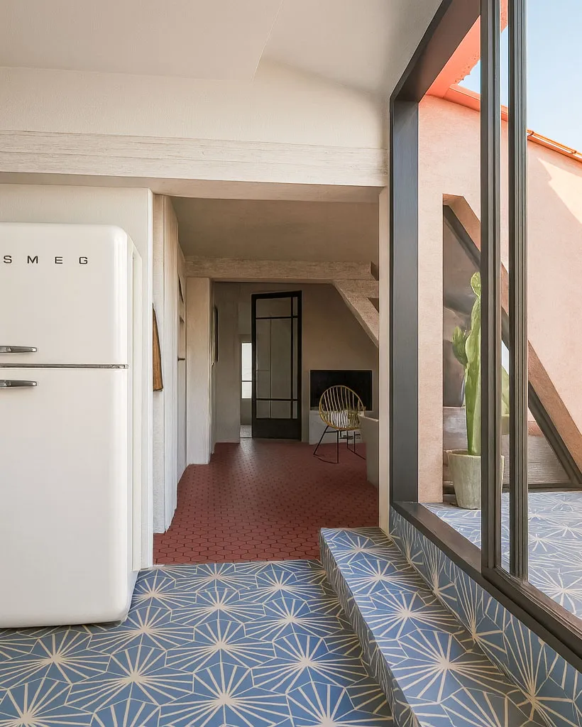 Pour créer une cohérence visuelle tout en apportant une touche contemporaine, j'ai opté pour un carrelage hexagonal qui fait référence au format des tomettes traditionnelles, mais dans un bleu dynamique avec un motif graphique. Ce choix permet de dialoguer avec l'existant tout en affirmant une identité plus moderne. L'autre avantage majeur : ce même carrelage se prolonge sur la terrasse tropézienne, créant une continuité intérieur-extérieur qui agrandit visuellement l'espace et unifie l'appartement.