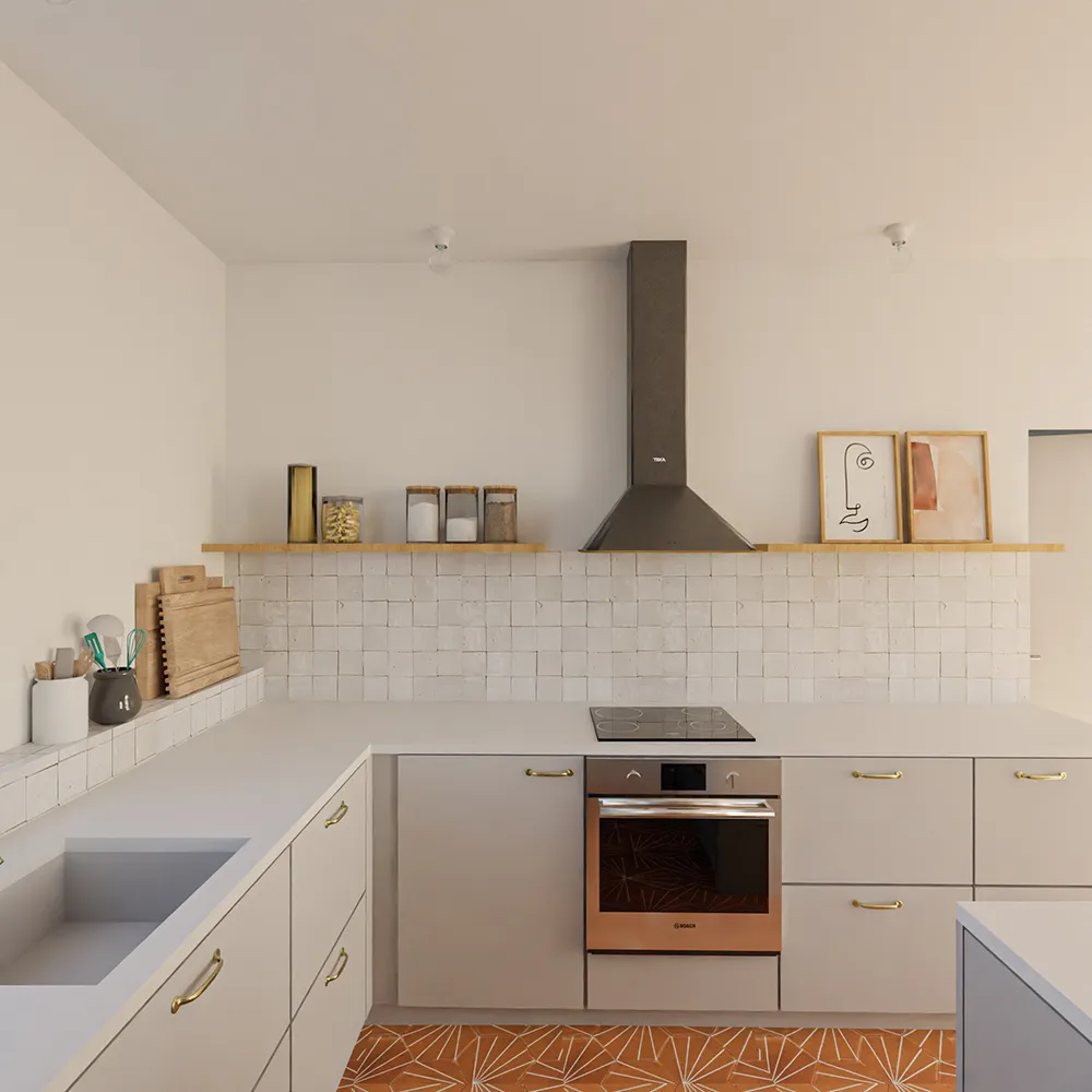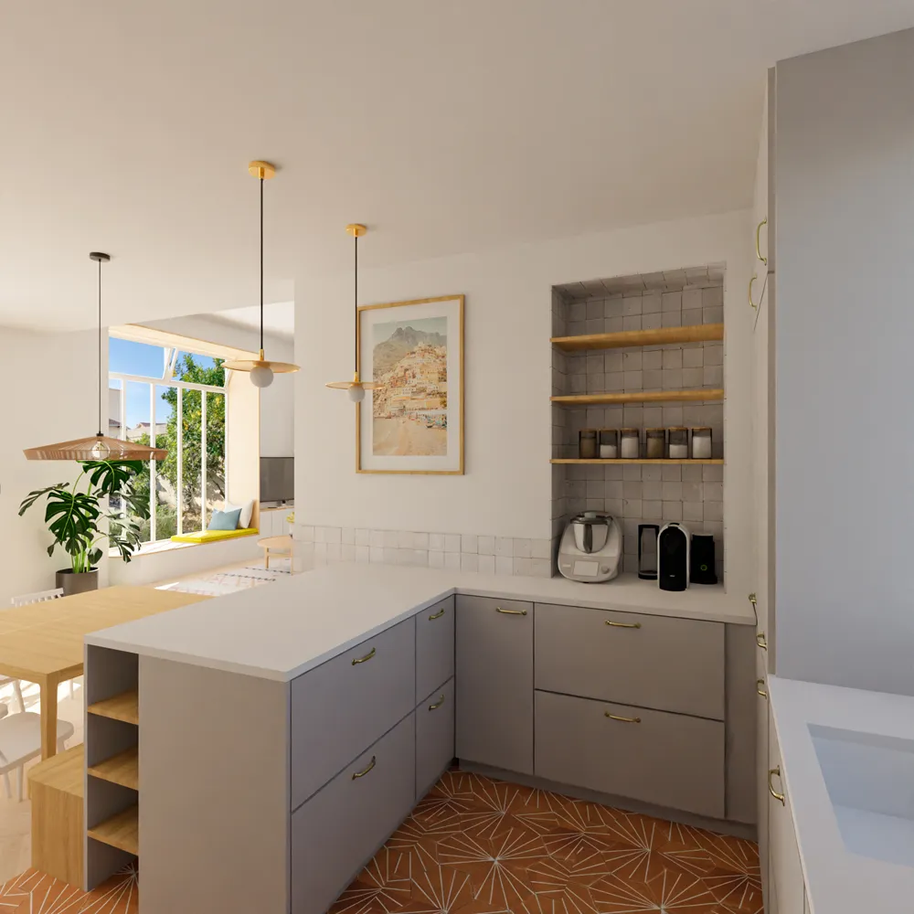 La cuisine se déploie en G – oui, c'est original ! – pour offrir un maximum de rangement, de fonctionnalité et de convivialité, tout en s'adaptant à la typologie de l'espace existant. Elle devient véritablement le cœur de la maison, comme le souhaitait la propriétaire.