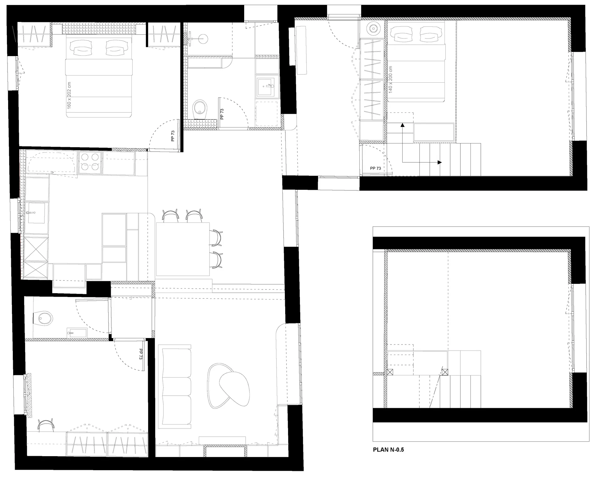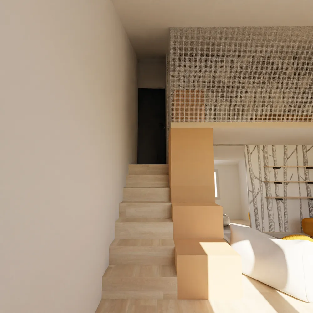 L'escalier a été redessiné en quart tournant pour qu'il ait une double fonction : accéder à la mezzanine et au reste de la chambre en contrebas.