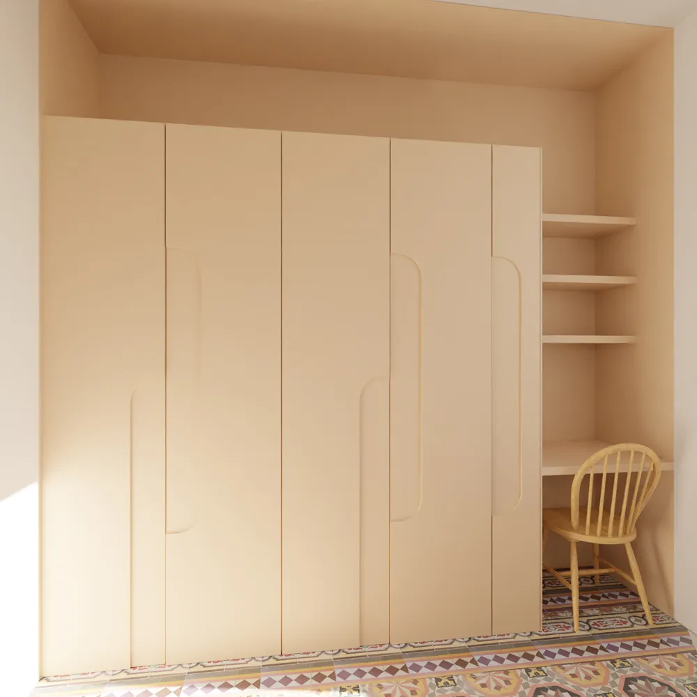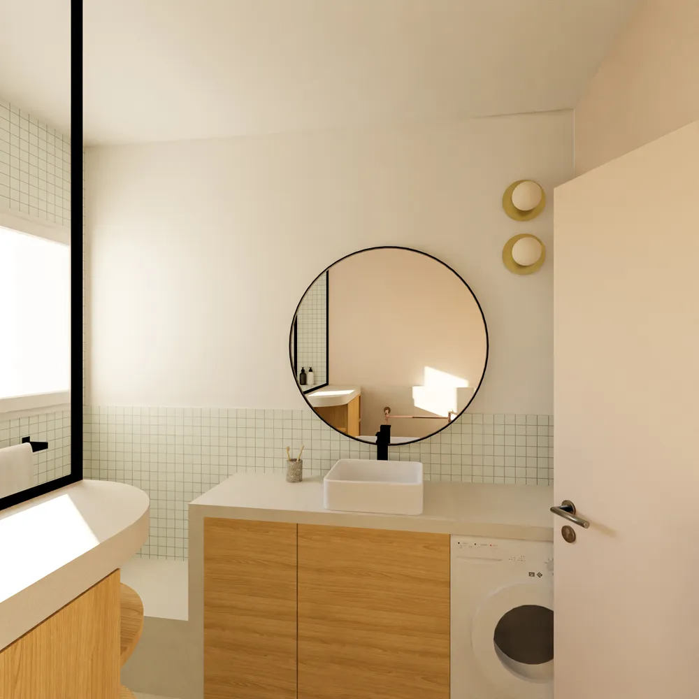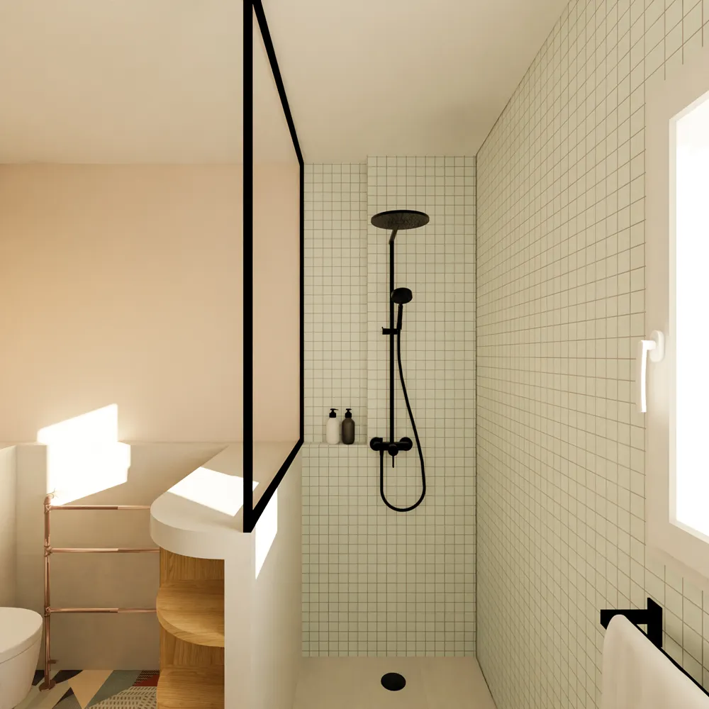 Dans le premier projet validé, la propriétaire avait choisi de créer une belle et grande salle d'eau dans cette pièce, inspirée par son magnifique sol d'origine. Nous avions alors placé un dressing accessible depuis la chambre. Seulement voilà, cela faisait renoncer à une troisième chambre dans une maison de 90m², à la possibilité d'avoir un bureau à part, à recevoir confortablement amis et famille pour quelques jours.