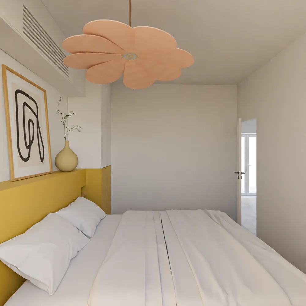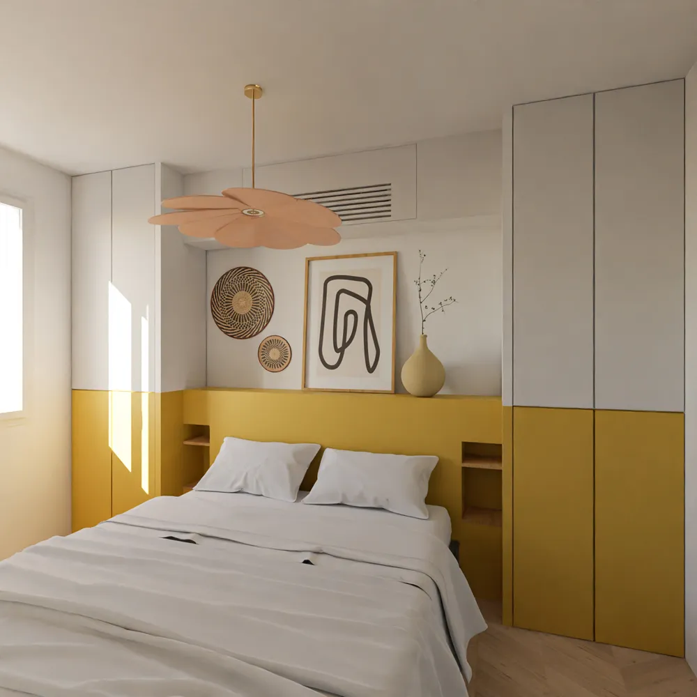 Le split qui était dans la cuisine (devenue salle d'eau) a été déplacé dans cette pièce et intégré dans un coffrage ajouré, pour que le tout forme un ensemble harmonieux. Le soubassement ocre apporte de la personnalité et de la chaleur à cette pièce devenue très accueillante.