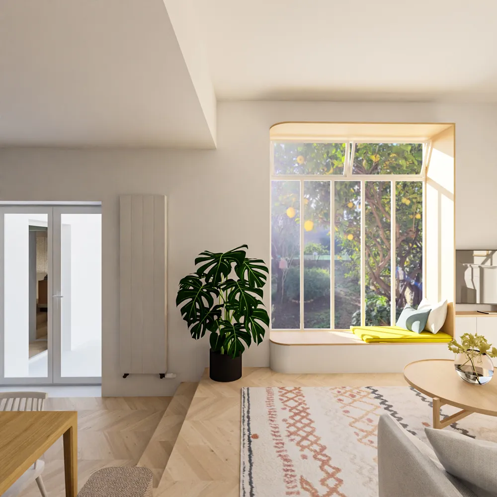 L'agrandissement de l'ouverture existante du salon est l'un des éléments clés du projet. Il permet de complètement élargir les perspectives vers l'extérieur, d'autant plus qu'un beau citronnier trône juste derrière, dans le jardin. L'espace salon étant assez petit, cette grande ouverture agrandit visuellement la pièce.