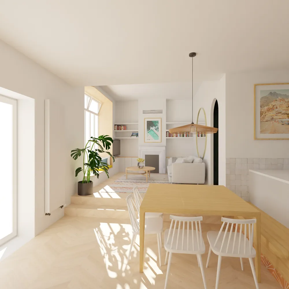 Le brief de la nouvelle propriétaire était clair : créer au moins deux belles chambres pour elle et son fils, beaucoup de rangements, une cuisine généreuse et fonctionnelle qui soit le cœur de la maison, un espace repas avec une banquette pour le côté convivial, et surtout, faire entrer la lumière et le jardin à l'intérieur de la maison.