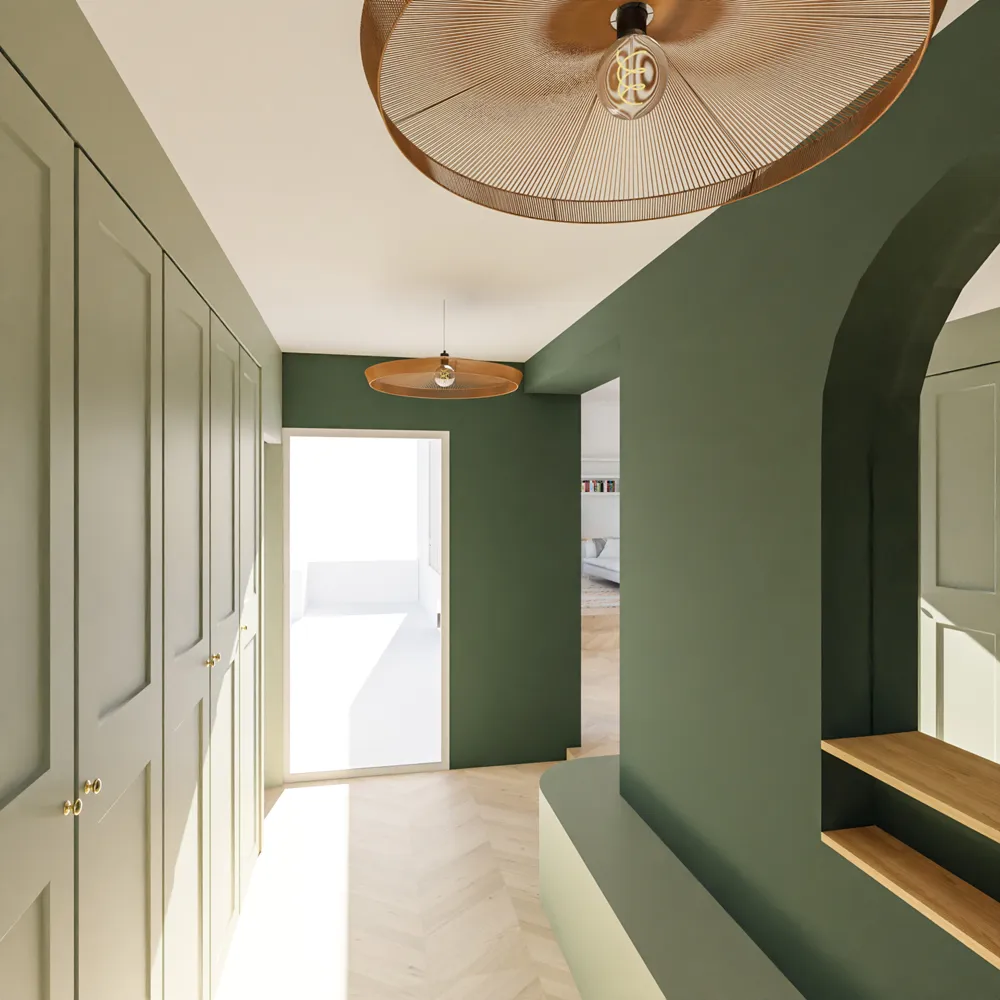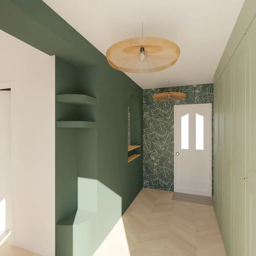 La niche existante est mise en valeur par des tablettes et un miroir sur mesure collé, tandis qu'un faux-plafond droit a été ajouté pour simplifier le volume tout en faisant passer les gaines techniques. La porte vitrée à double battants a été remplacée par une imposte vitrée fixe – une autre porte-fenêtre donnant déjà accès à la terrasse juste après l'angle. Cette modification permet d'avoir une plus grande surface vitrée et un joli cadrage depuis l'entrée. L'ensemble est peint dans un camaïeu de vert qui rappelle l'extérieur et crée une transition douce entre dedans et dehors.