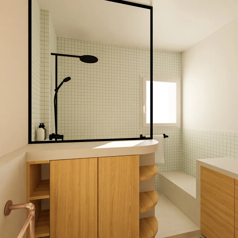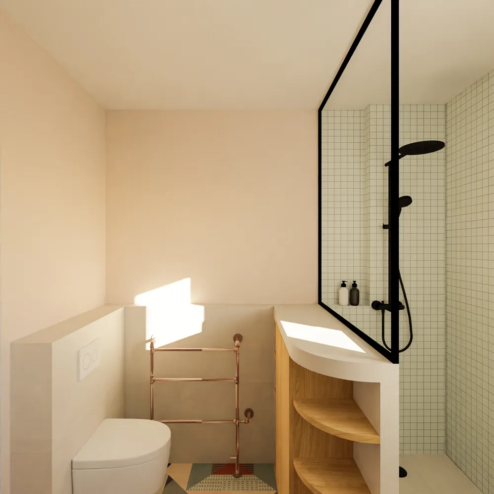 La salle d'eau prend place dans l'ancienne cuisine, qui était complètement étriquée dans ce petit volume. Un sol à la forte personnalité répond à une mosaïque mate vert d'eau, du béton ciré gris clair et un blanc rosé. La douche est installée tout au fond dans la largeur de la pièce, tandis qu'en face se déroule un linéaire meuble vasque-banquette, intégrant le lave-linge.