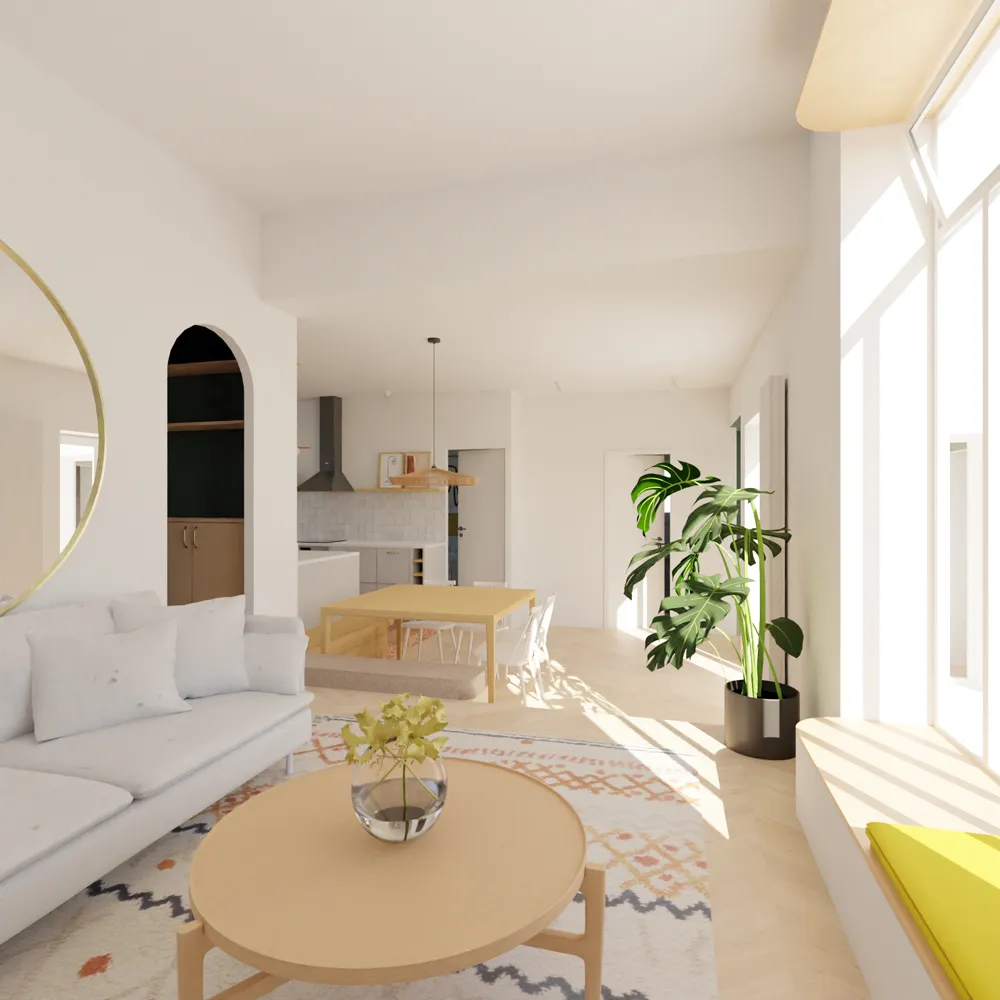 Vu depuis l'autre extrémité de l'espace de vie, on distingue mieux les grands changements qui ont été effectués en termes de cloisonnement. Le mur du salon a été prolongé en angle pour créer un sas menant aux WC et à la troisième chambre, tandis que l'ancienne salle d'eau a été entièrement déposée pour y installer une cuisine ouverte. Le renfoncement qui accueillait la cuisine a été fermé pour créer la nouvelle salle d'eau.