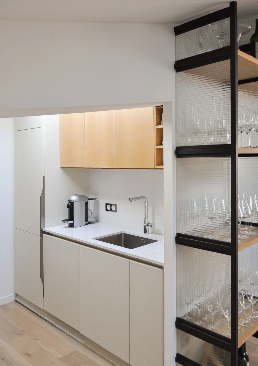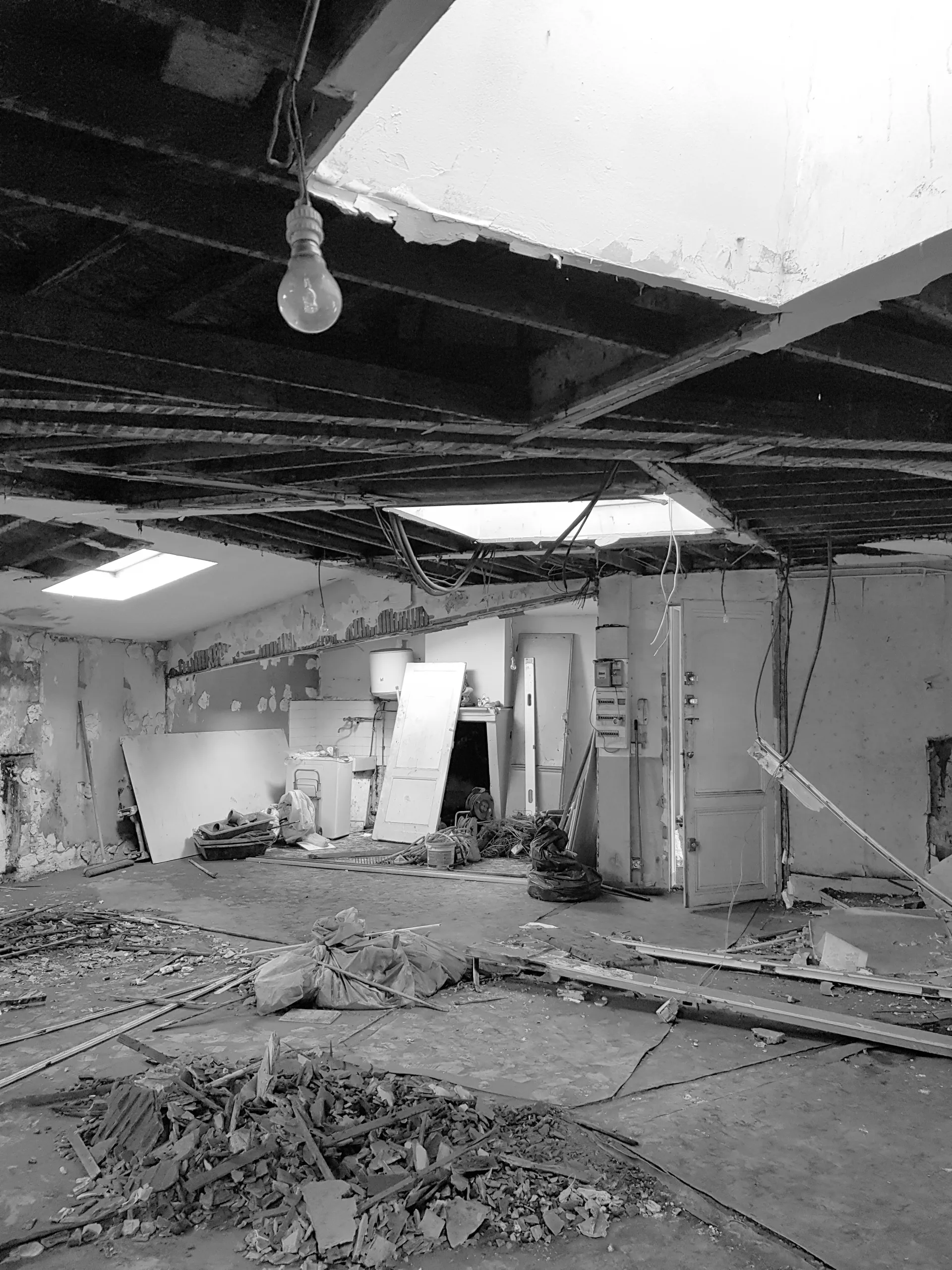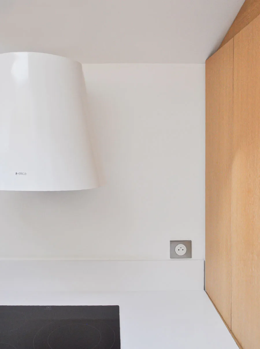 Partant de là, tout le volume est désossé pour retrouver les plafonds rampants et le plateau vide. Cette opération de déconstruction permet de redécouvrir l'architecture d'origine de ces combles, avec leurs pentes caractéristiques qui donnent tant de personnalité aux appartements sous les toits.