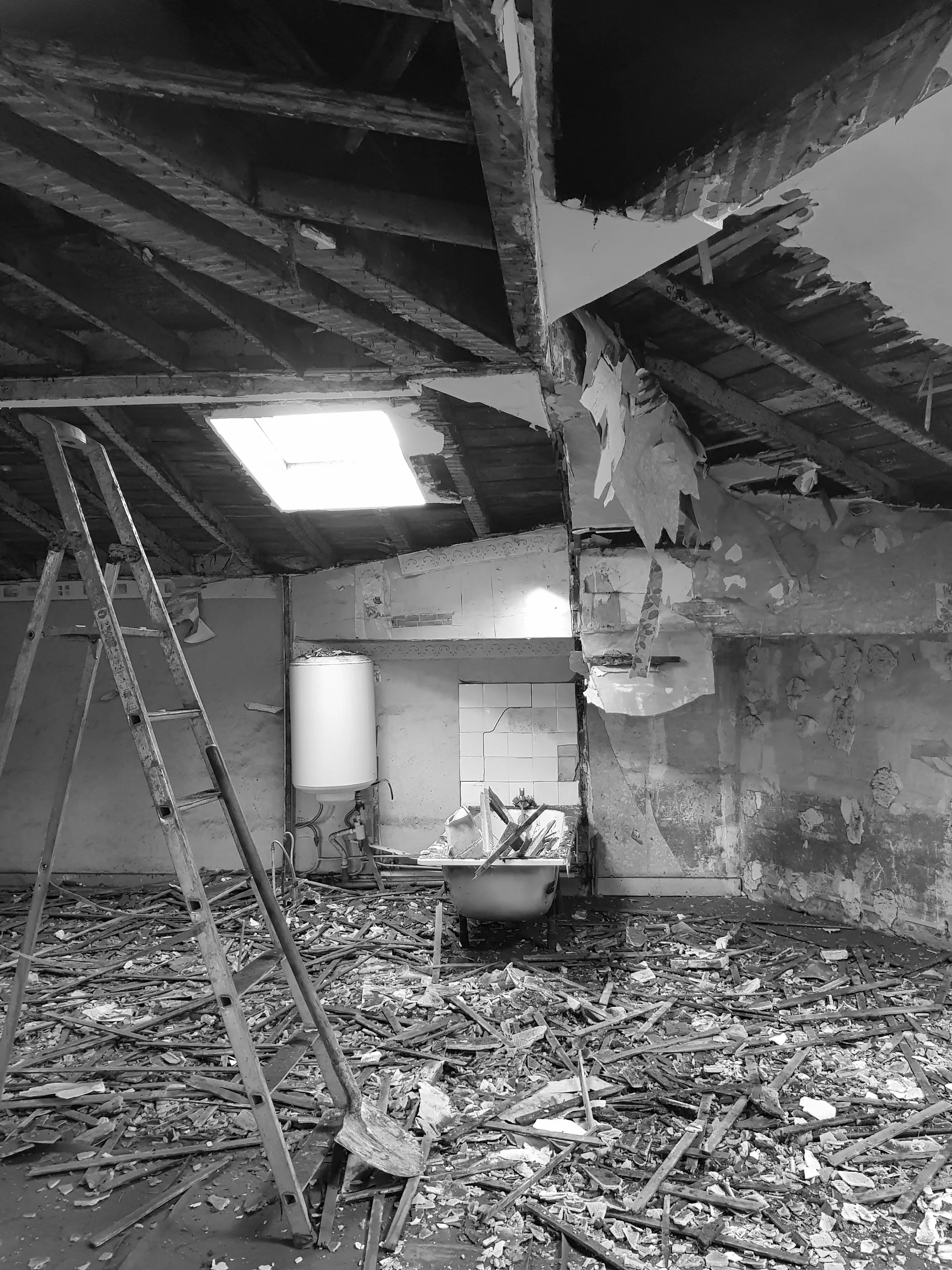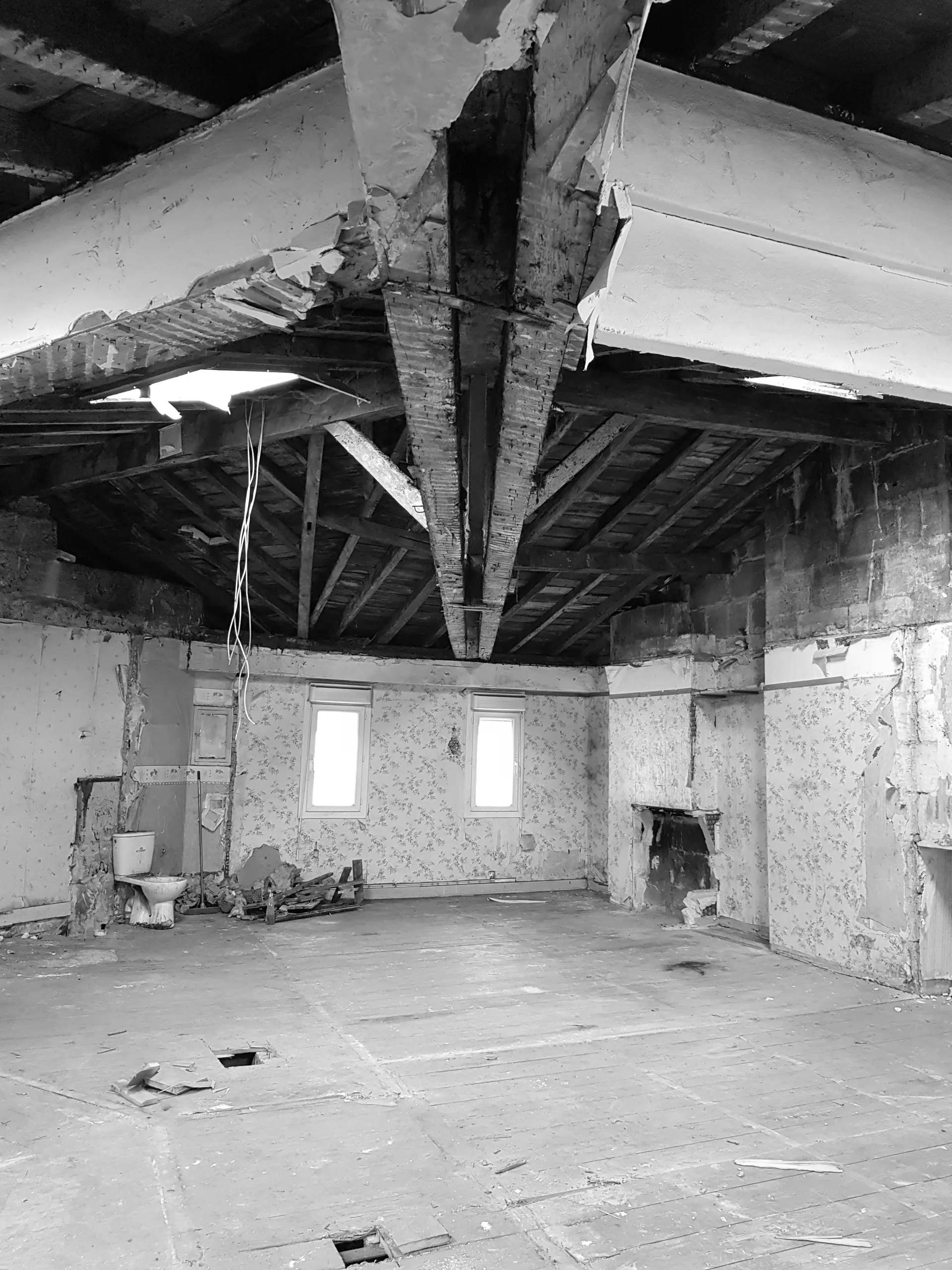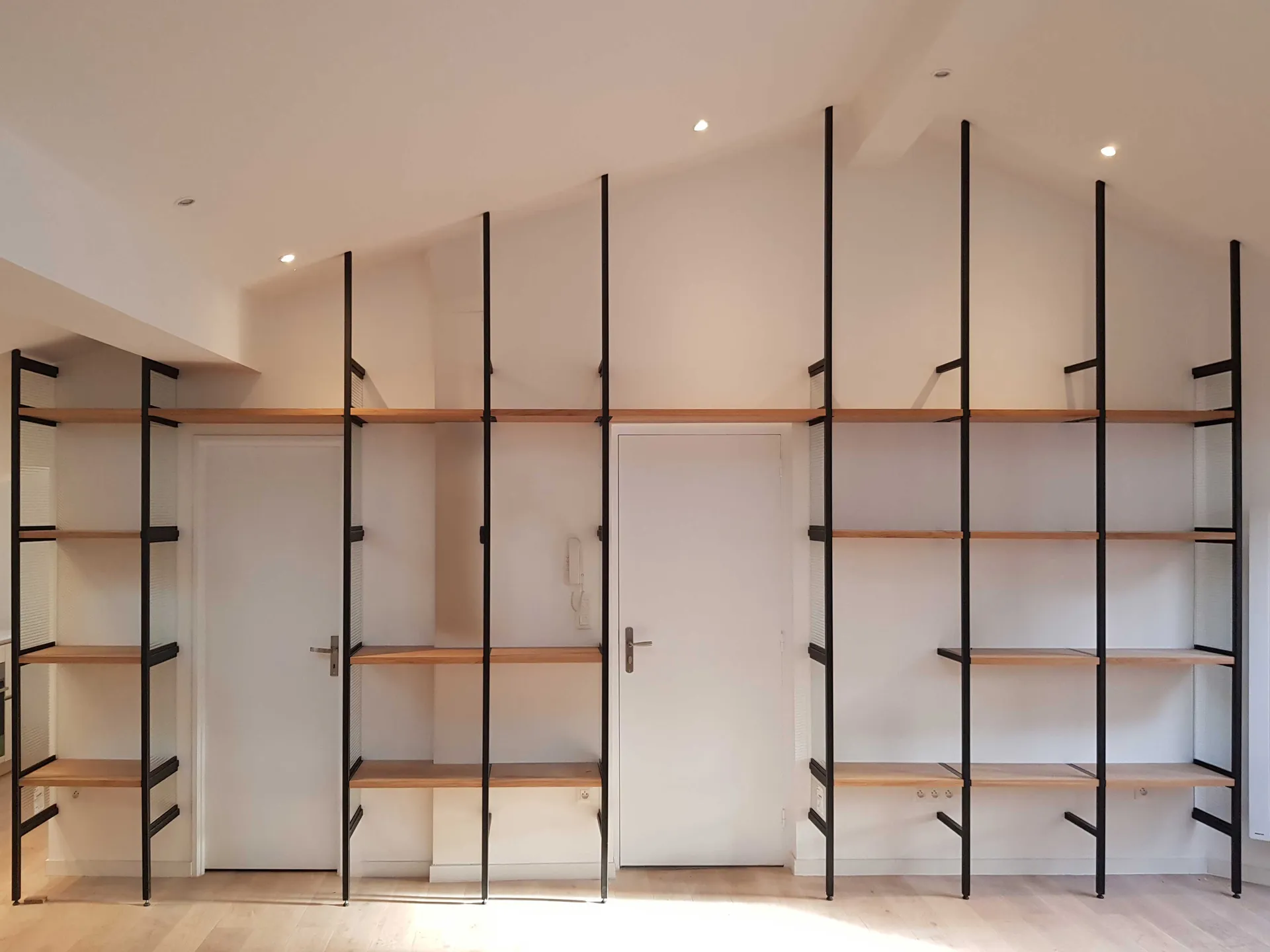 Partant de là, tout le volume est désossé pour retrouver les plafonds rampants et le plateau vide. Cette opération de déconstruction permet de redécouvrir l'architecture d'origine de ces combles, avec leurs pentes caractéristiques qui donnent tant de personnalité aux appartements sous les toits.