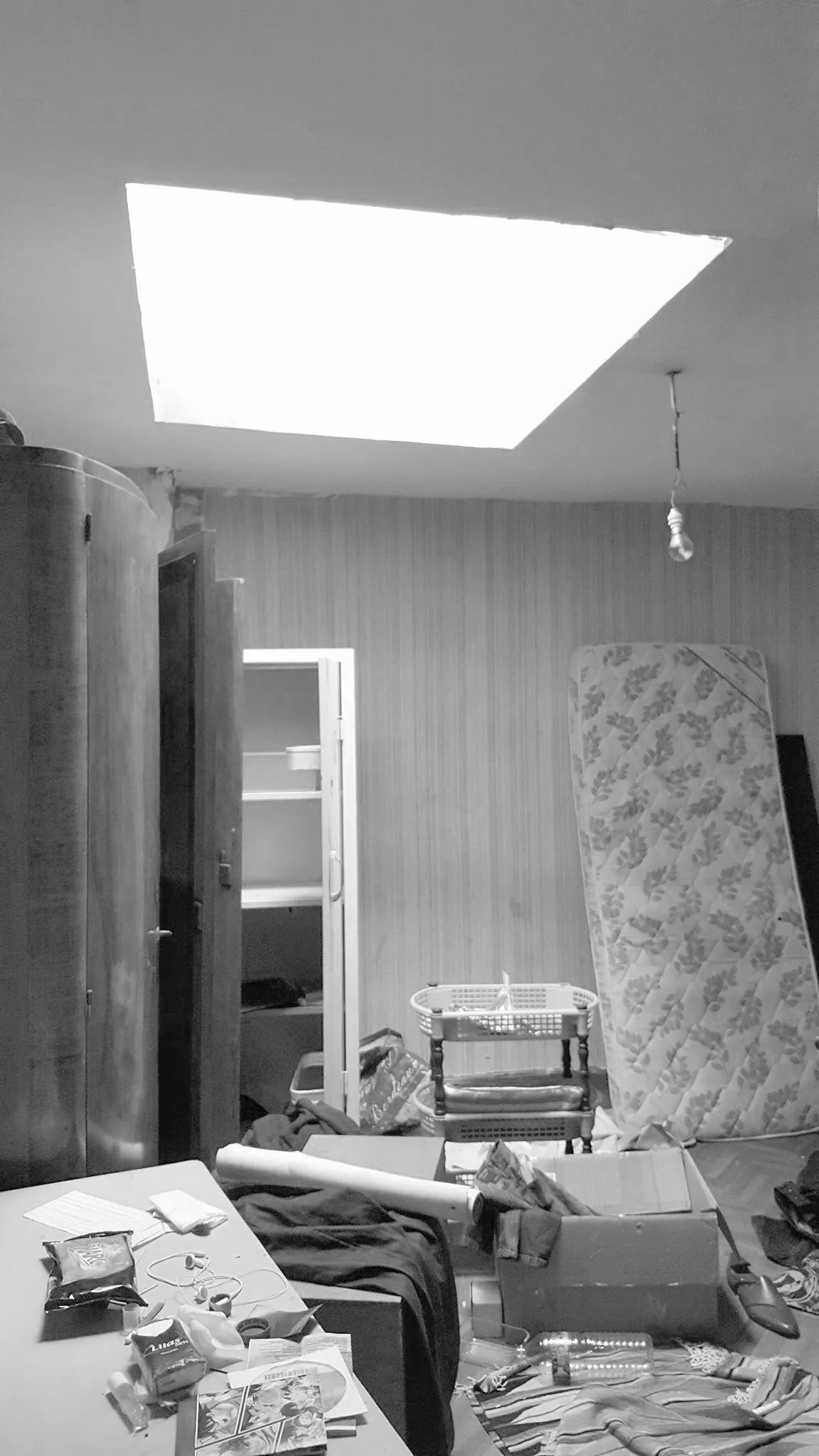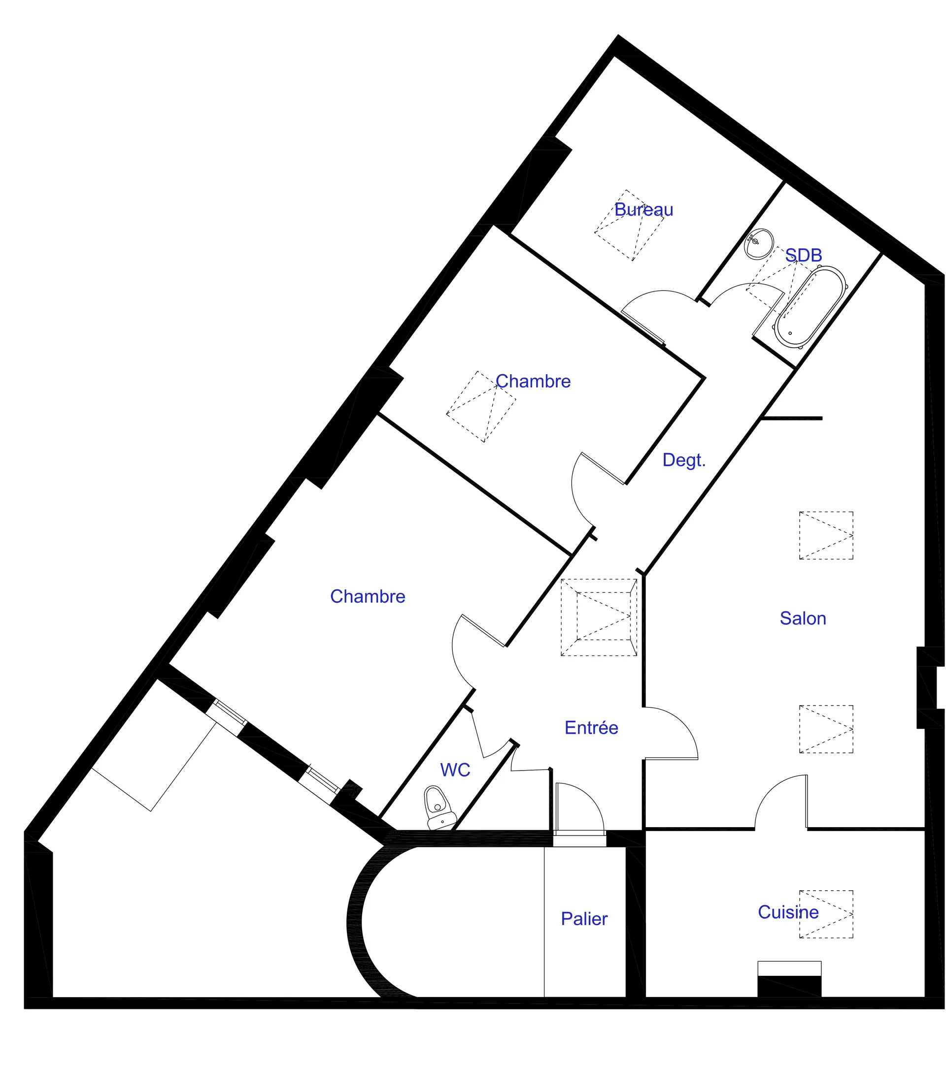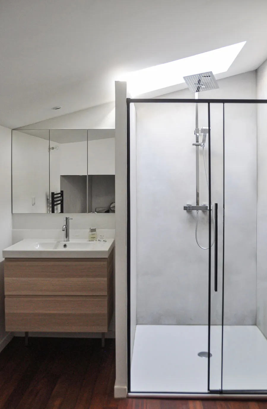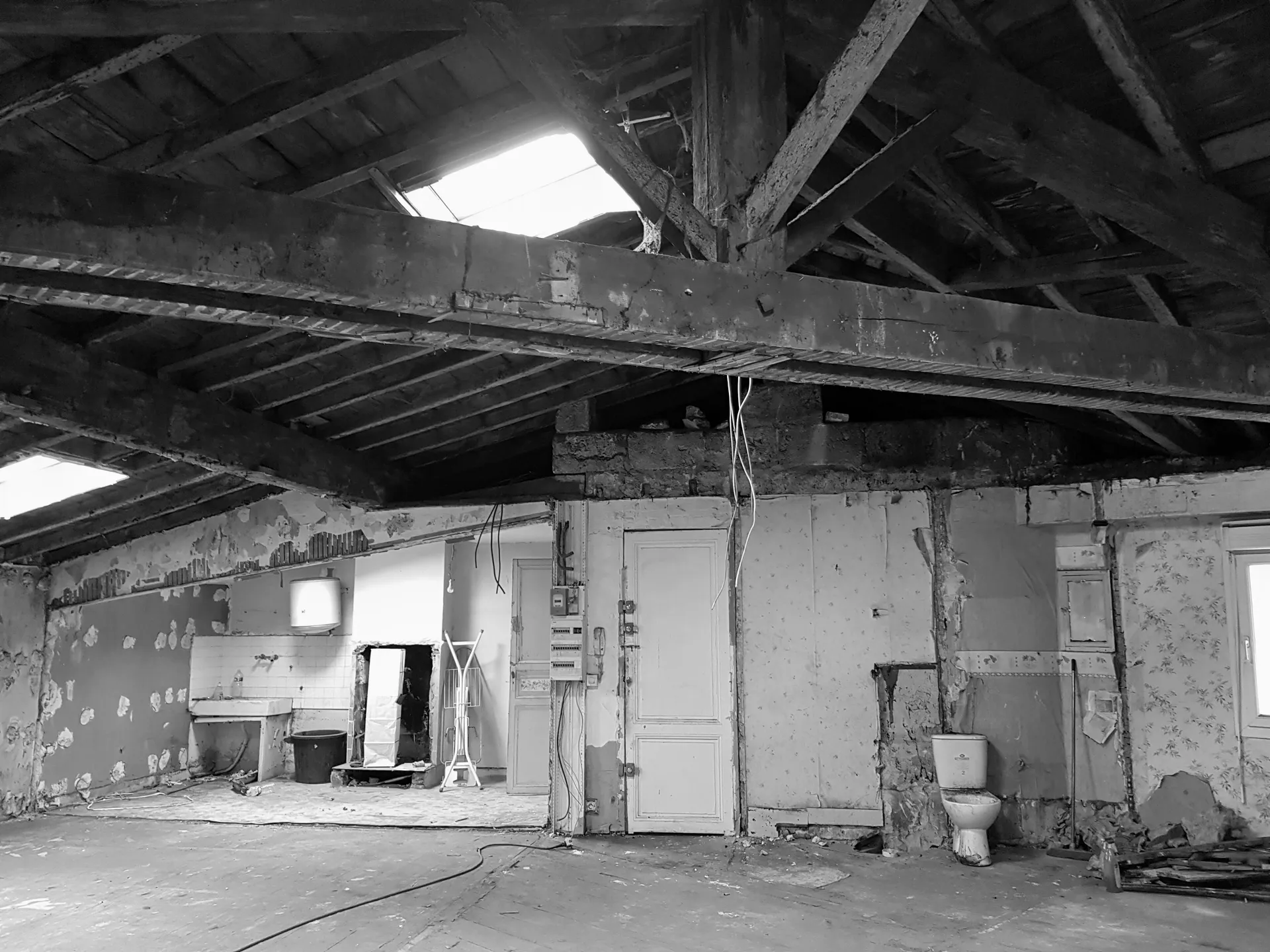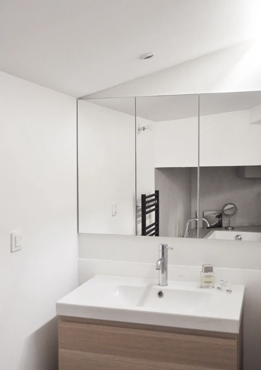 Cet appartement du centre de Bordeaux, presque insalubre lorsque le nouveau propriétaire l'a acheté, cachait bien tout son potentiel. Placé au dernier étage, il était assez bas de plafond et éclairé principalement par des velux engloutis dans des puits de lumière très profonds, la plupart des rampants ayant été recouverts d'un faux-plafond droit.