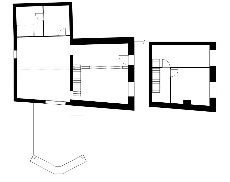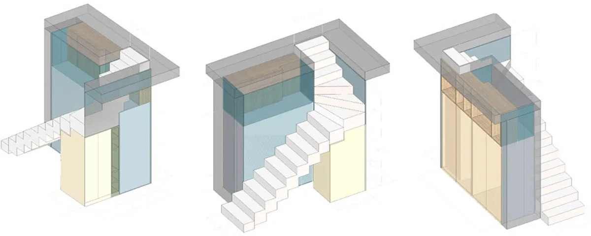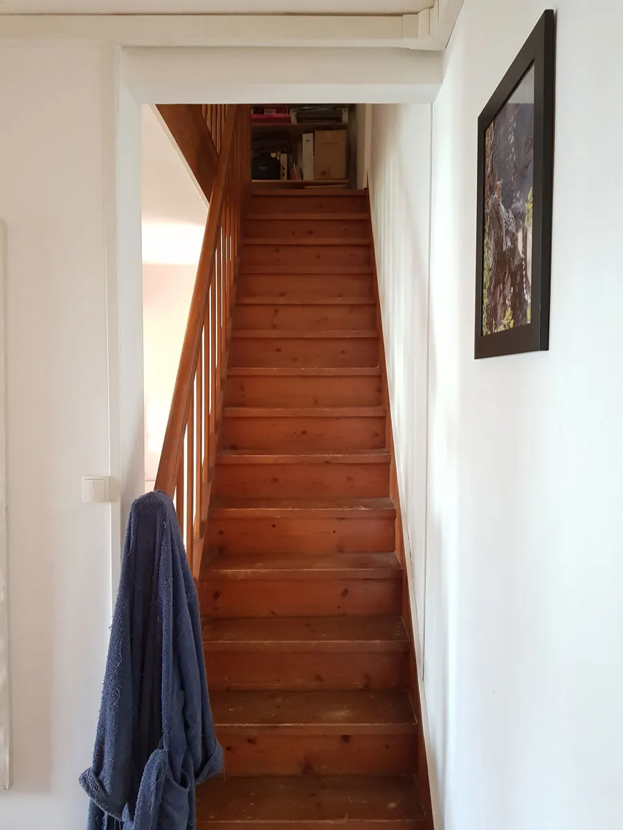 L'escalier a fait l'objet d'une étude toute particulière. Celui existant, droit, était trop raide, mais en placer un autre différent était assez complexe à cause de la présence d'une poutre à l'entrée de la trémie, qui bloquait la hauteur sous passage disponible et contraignait ainsi sa disposition.