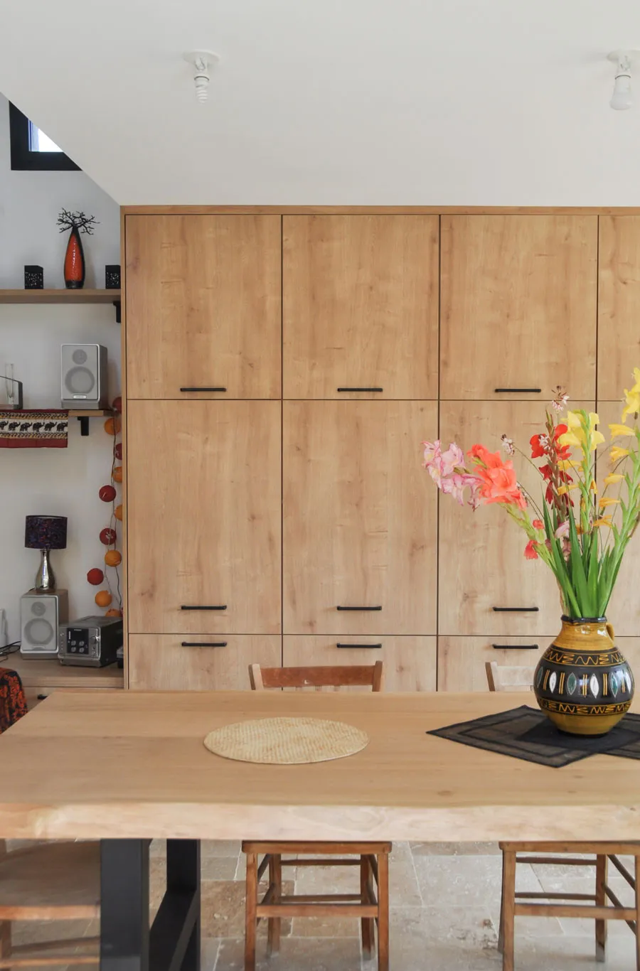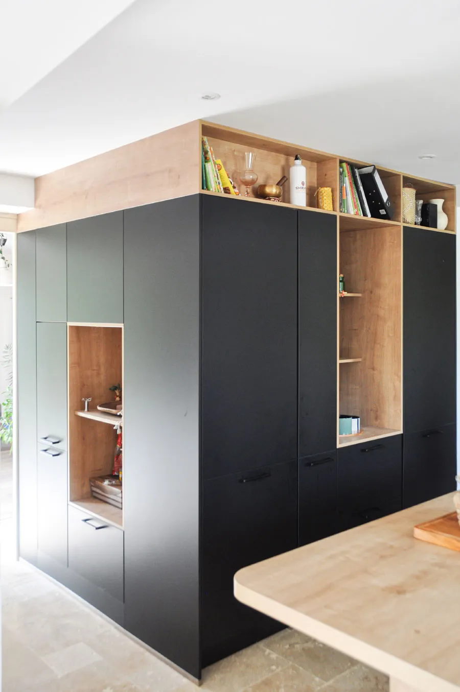 Viennent ainsi se placer le frigo, le congélateur et une grande quantité de rangements complémentaires, le bloc étant ouvert de niches par endroit pour le rendre plus décoratif et fonctionnel. Cette solution ingénieuse résout simultanément plusieurs problématiques : l'escalier devient plus confortable, la cuisine gagne en rangements, et l'ensemble s'intègre harmonieusement dans le nouvel espace.