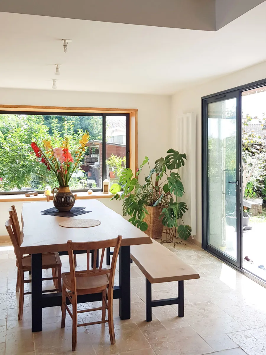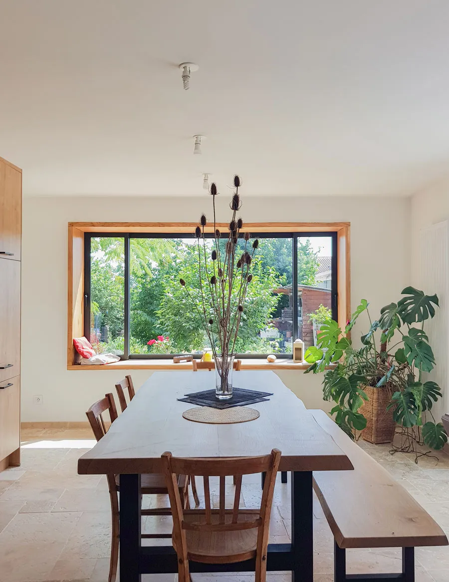 Vue de l'intérieur, la cuisine a été entièrement repensée et s'ouvre désormais sur la salle à manger, installée dans l'extension. La grande ouverture sur le jardin a été pensée comme un tableau contemplatif. L'épaisseur du mur est habillée d'un bandeau en chêne invitant à s'asseoir et regarder le paysage.