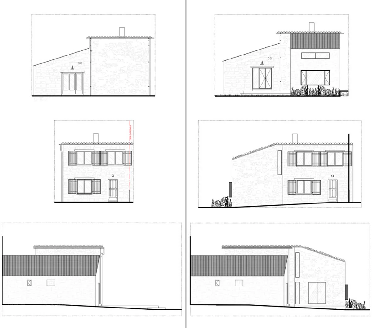 Le corps principal de la maison, comme traditionnellement, était très peu ouvert sur l'extérieur, rendant l'intérieur assez sombre et coupé du beau jardin. Cependant, les propriétaires ne souhaitaient pas dénaturer la bâtisse en pierre en y greffant une extension en totale rupture avec l'existant. Cette dernière étant assez imposante par rapport à la taille initiale de la maison, garder un revêtement en pierre permet de beaucoup mieux l'intégrer et de donner l'impression que les choses ont toujours été ainsi.