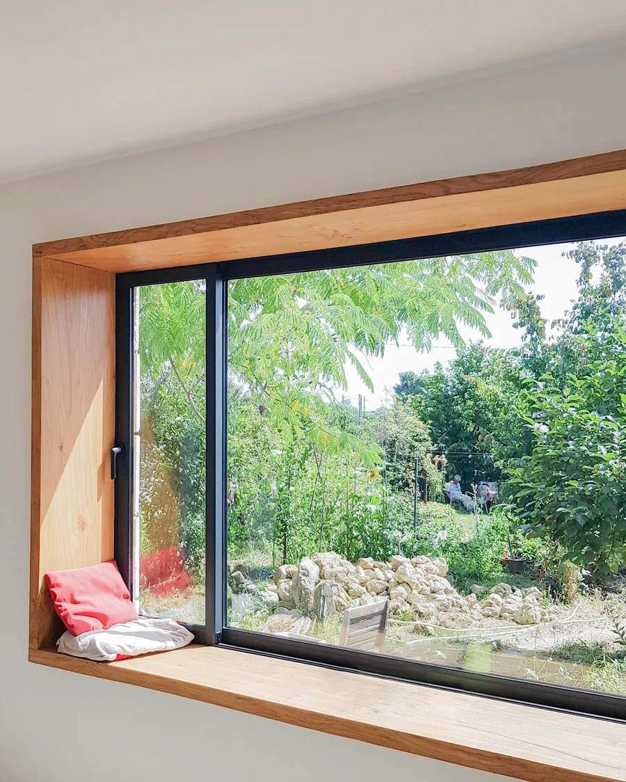 La grande ouverture sur le jardin a été pensé comme un tableau comtemplatif. L'épaisseur du mur est habillée d'un bandeau en chêne invitant à s'asseoir et regarder le paysage.