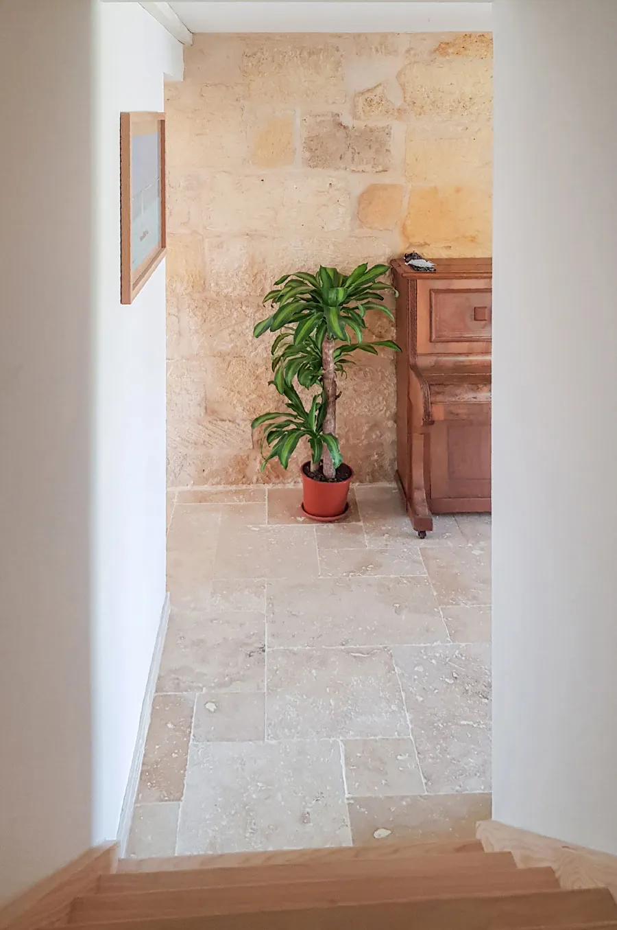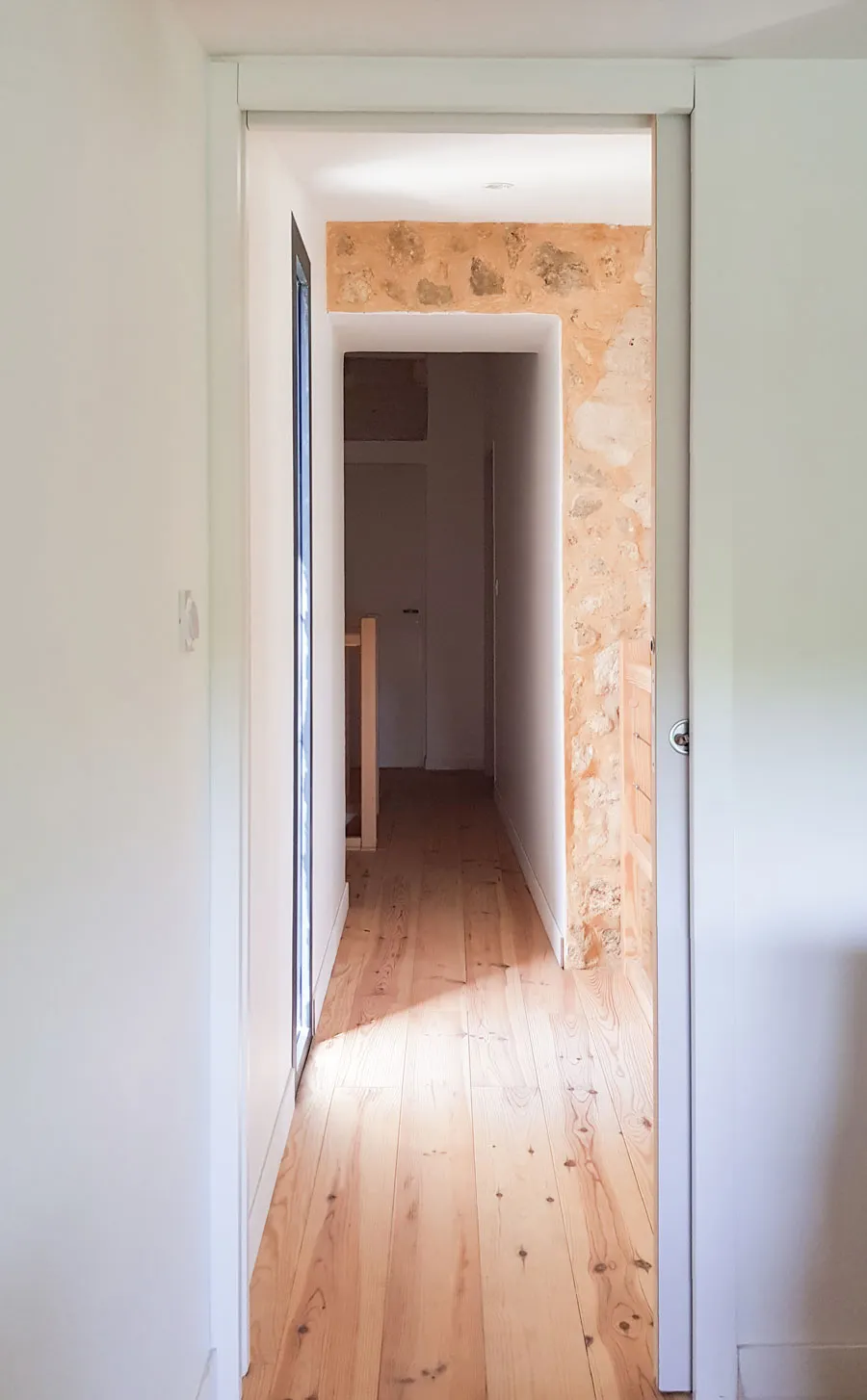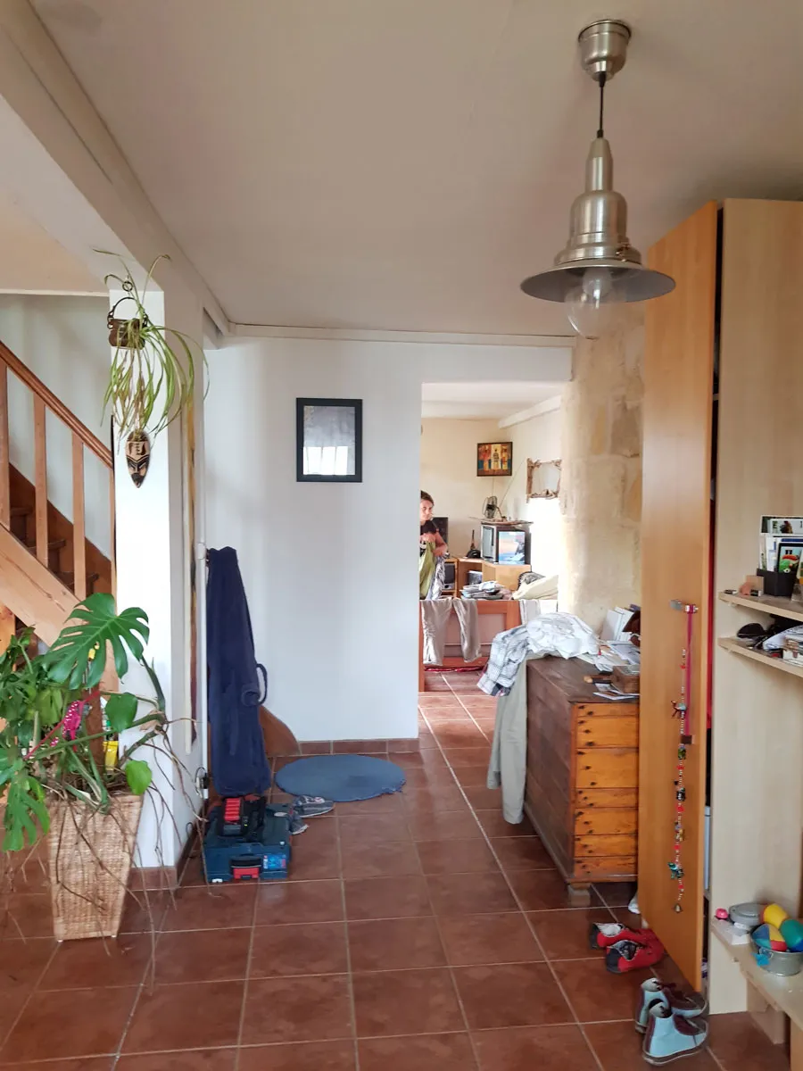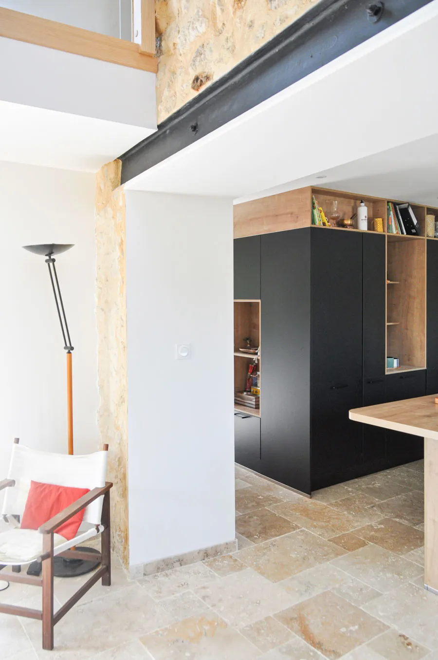 Le vide sur séjour se devine dans ces volumes, et l'ouverture de l'ancien mur de façade en pierre est bien visible. Le nouvel intérieur fait la part belle aux matériaux naturels : bois, métal et travertin s'associent pour une ambiance simple et authentique, en harmonie avec le caractère de la bâtisse.