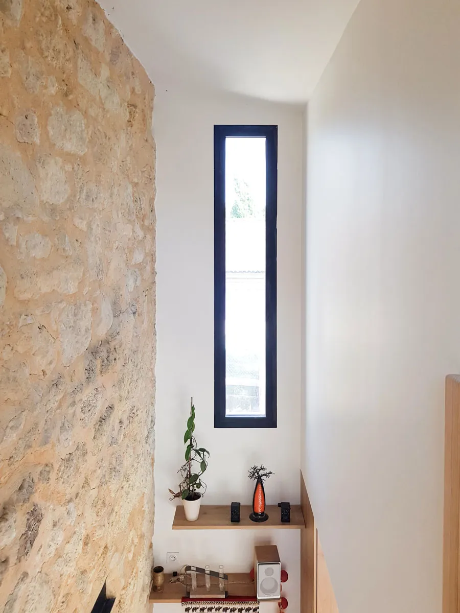 Une baie vitrée à gauche permet d'accéder à la terrasse directement, tandis que des ouvertures fixes en forme de meurtrières, en haut et en bas, laissent la lumière traverser la maison d'Est en Ouest. Ces fenêtres verticales évoquent l'architecture traditionnelle tout en apportant une touche contemporaine.