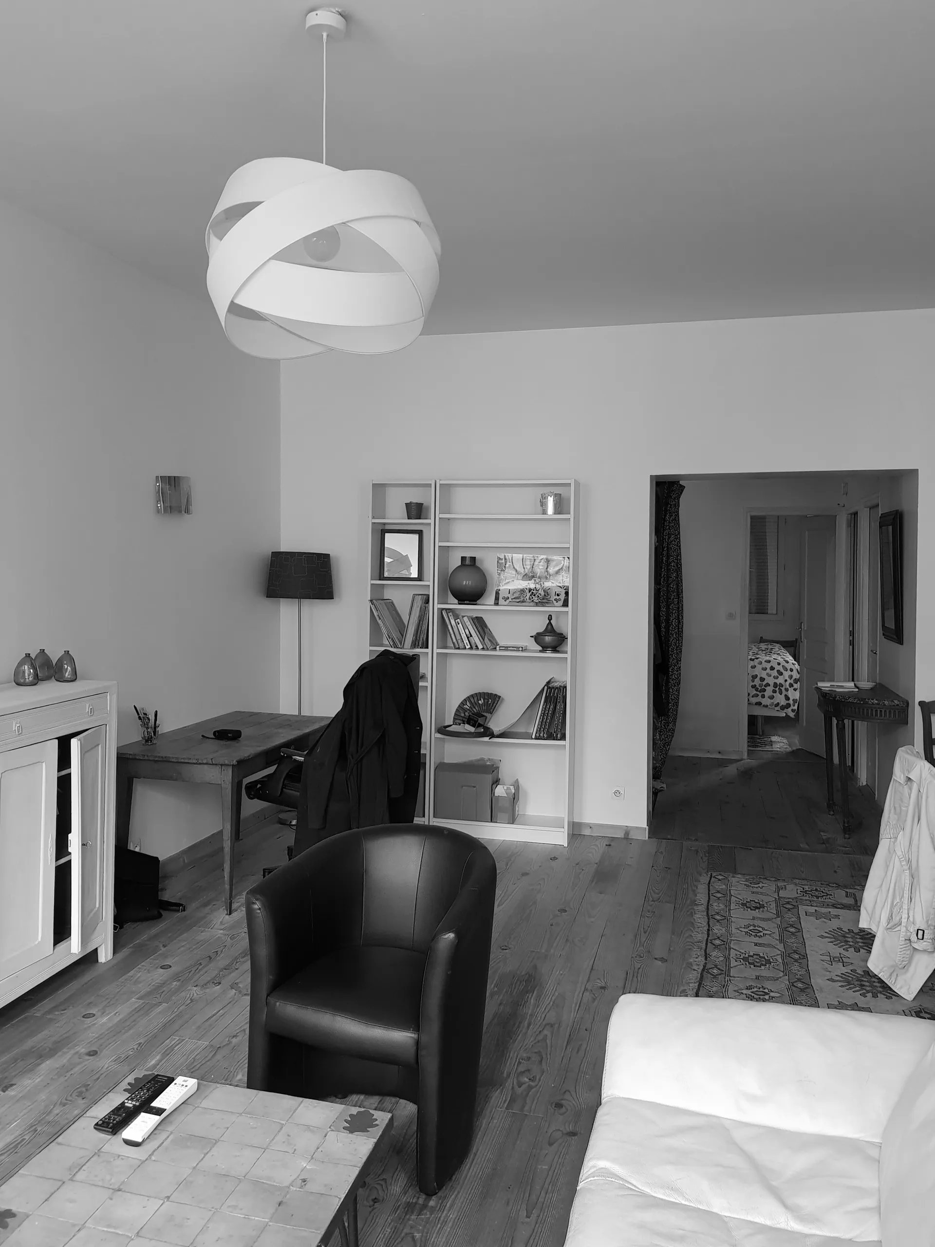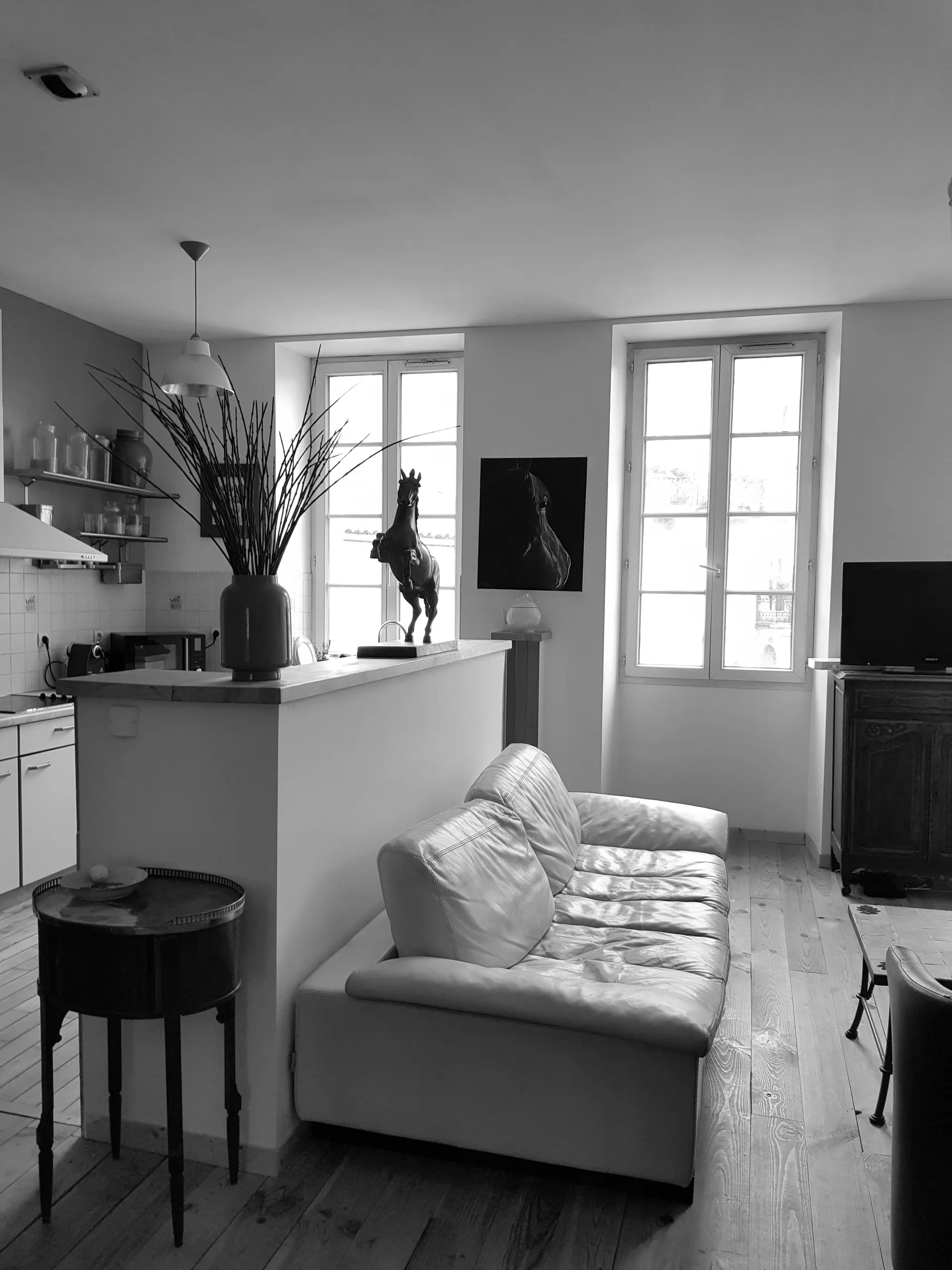 Le nouveau propriétaire m'a donc demandé de lui faire des propositions mettant en valeur les beaux volumes et la luminosité de la pièce de vie. Il voulait un petit espace bureau, des rangements qui n'encombrent pas la pièce, et un ensemble plus moderne tout en étant en accord avec l'immeuble en vieilles pierres et le quartier ancien dans lequel l'appartement est situé.