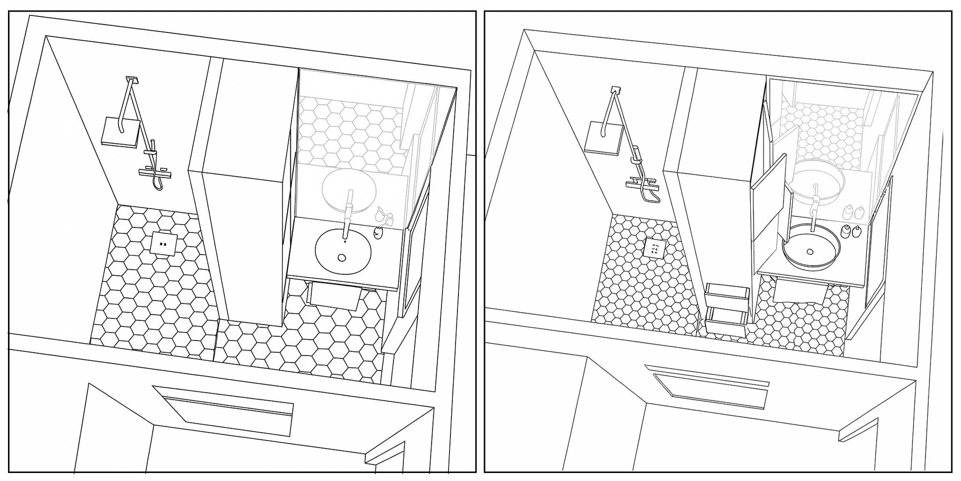 Remonter simplement la cloison n'était pas idéal car le besoin n'étant pas quotidien, il était dommage de le priver du volume. Je lui ai donc proposé une cloison en accordéon pouvant être entièrement ouverte ou fermée au besoin.