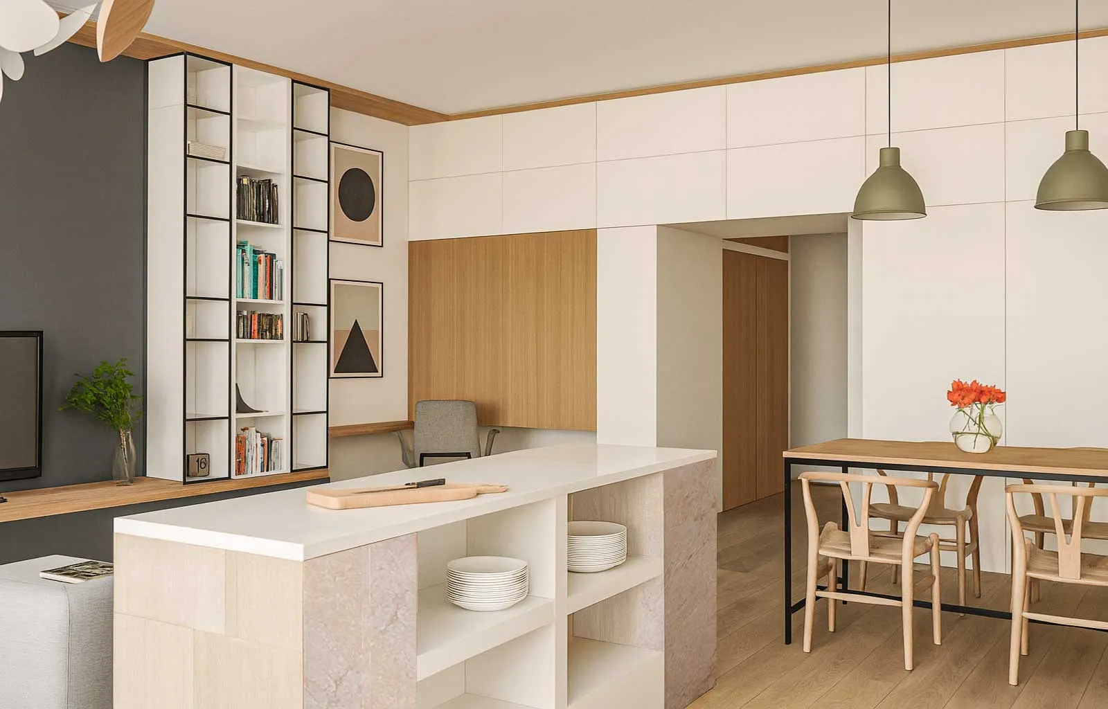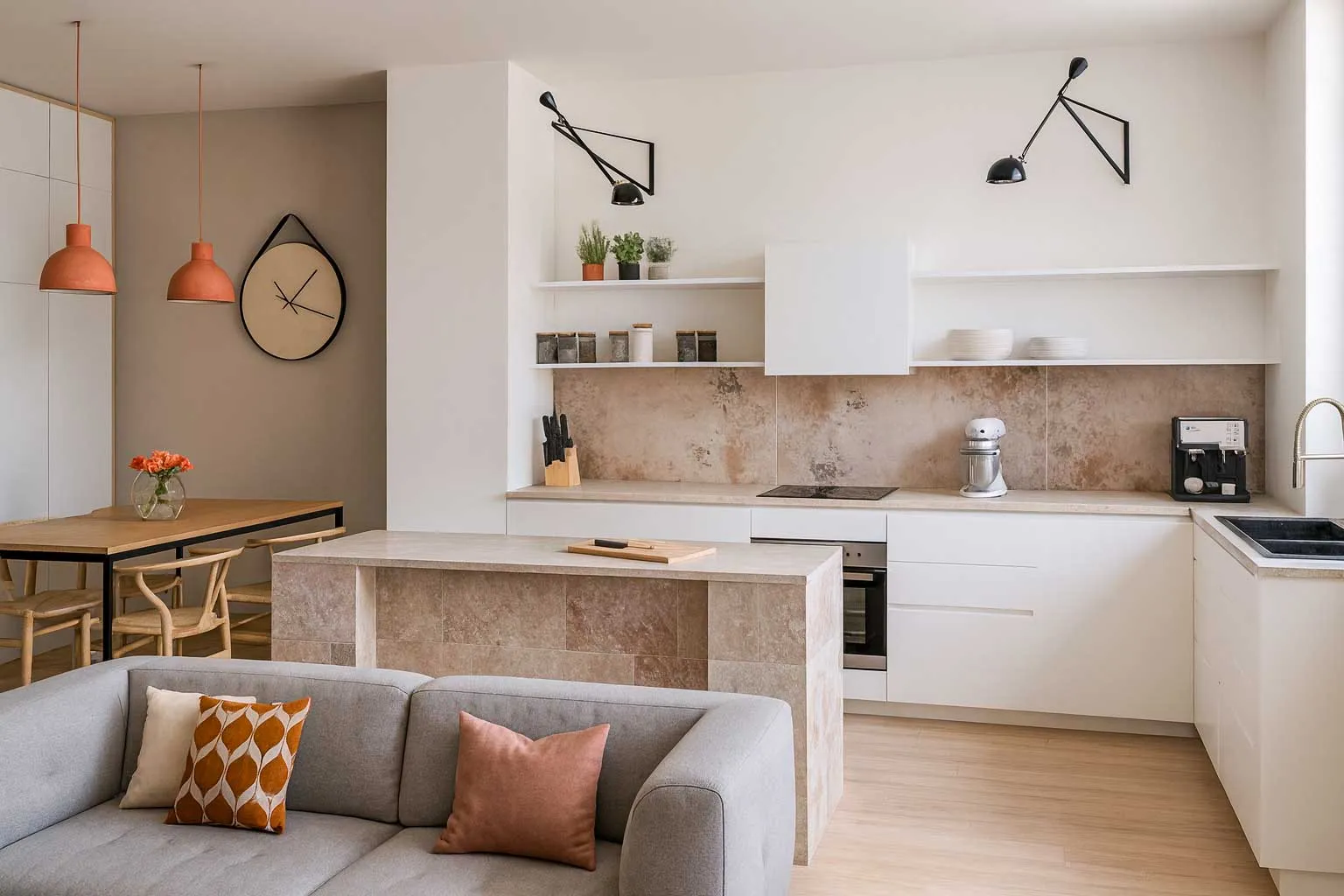 Cette rénovation partielle d'appartement ancien à Bordeaux illustre comment il est possible de moderniser un bien tout en respectant son caractère patrimonial. Les rangements invisibles, la porte coulissante à rideau pour le bureau, et l'îlot en pierre de Frontenac créent un équilibre subtil entre fonctionnalité contemporaine et respect de l'existant.
