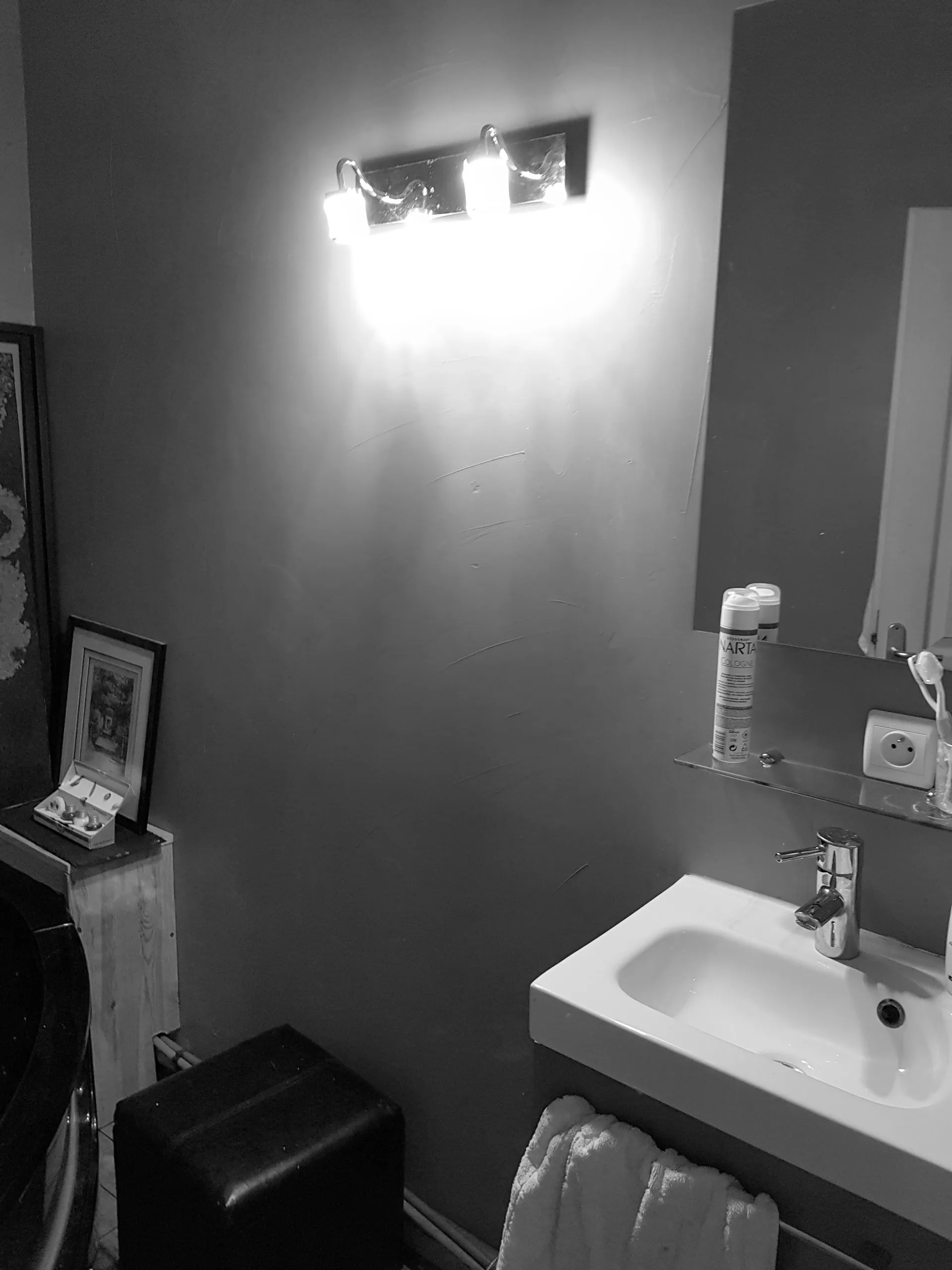 La salle d'eau était la pièce sur laquelle il fallait opérer des travaux de fond. Petite et sans fenêtre, nous avons jugé utile de créer des impostes vitrés opaques donnant sur le couloir et la petite chambre (avec sa fenêtre sur cour juste en face).