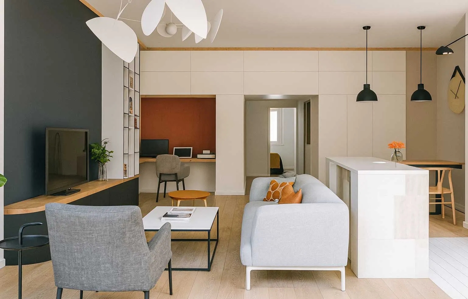 Dans la pièce à vivre, il a été décidé de doubler le grand mur porteur par des rangements toute hauteur sans poignées, les rendant presque invisibles. Un petit coin bureau a été dégagé dans l'angle, et comme le propriétaire fait souvent du télétravail, il était important de pouvoir tout occulter sans avoir à tout déplacer.