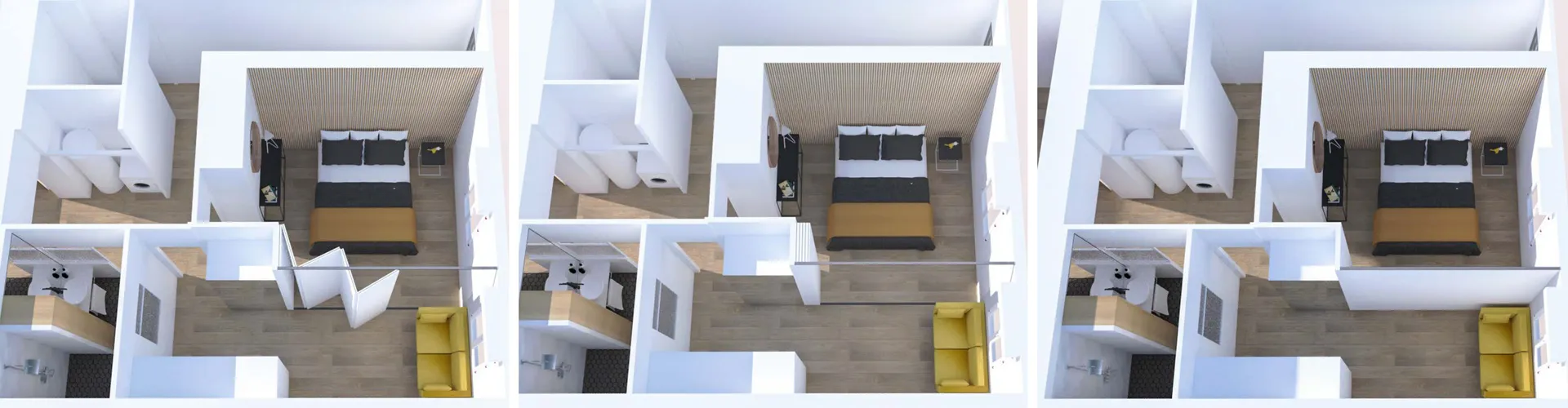 Ouverte, il dispose d'une grande chambre avec un canapé et un beau coin dressing. Fermée, le canapé se déplie pour devenir un lit et l'invité dispose d'une chambre indépendante, puisqu'elle a désormais une porte sur le couloir.